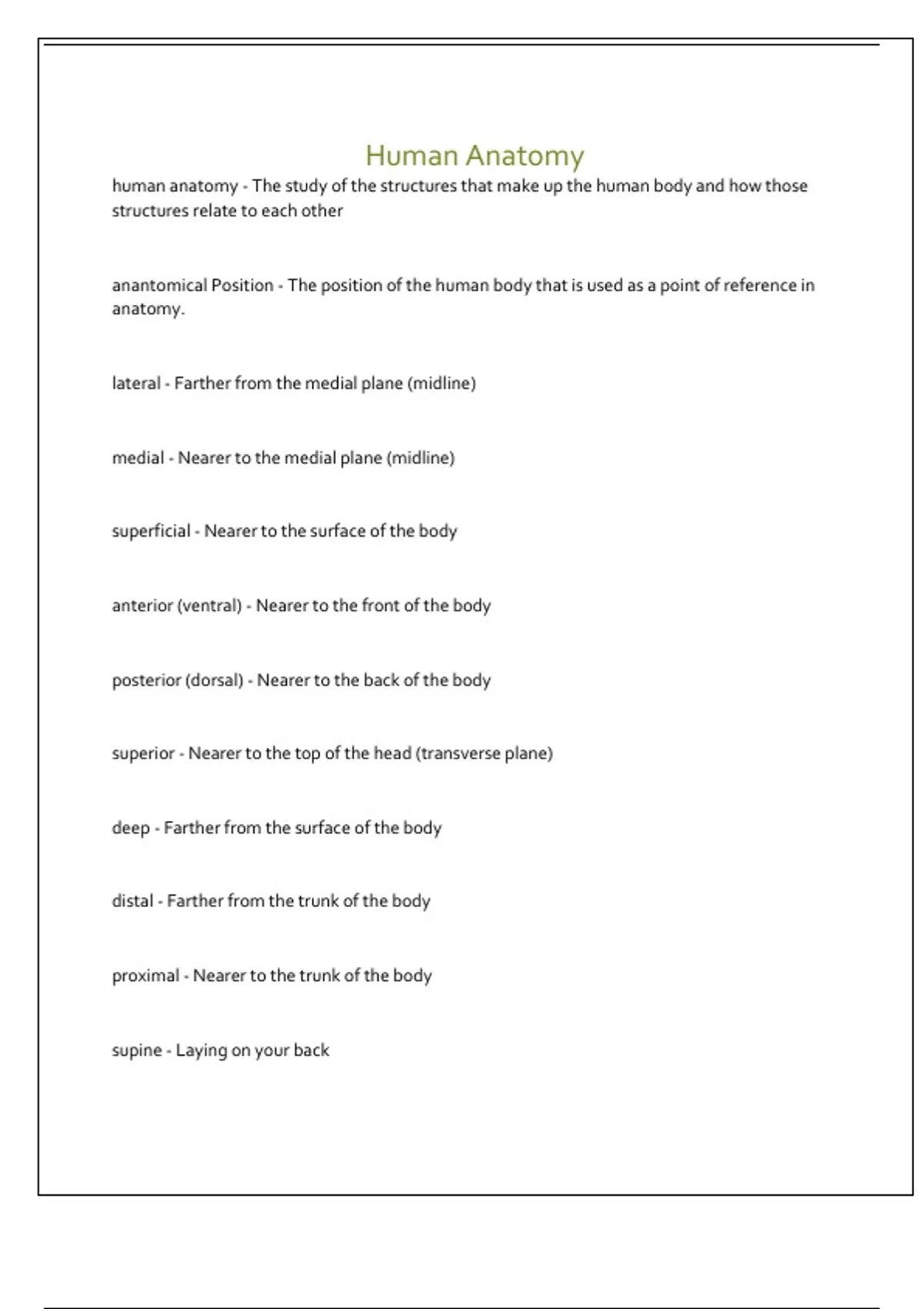human anatomy - The study of the structures that make up the human body and how those structures relate to each other anantomical Position - The position of the human body that is used as a point of reference in anatomy. lateral - Farther from the medial plane (midline) medial - Nearer to the medial plane (midline) superficial - Nearer to the surface of the body anterior (ventral) - Nearer to the front of the body posterior (dorsal) - Nearer to the back of the body superior - Nearer to the top of the head (transverse plane) deep - Farther from the surface of the body distal - Farther from the trunk of the body proximal - Nearer to the trunk of the body supine - Laying on your back