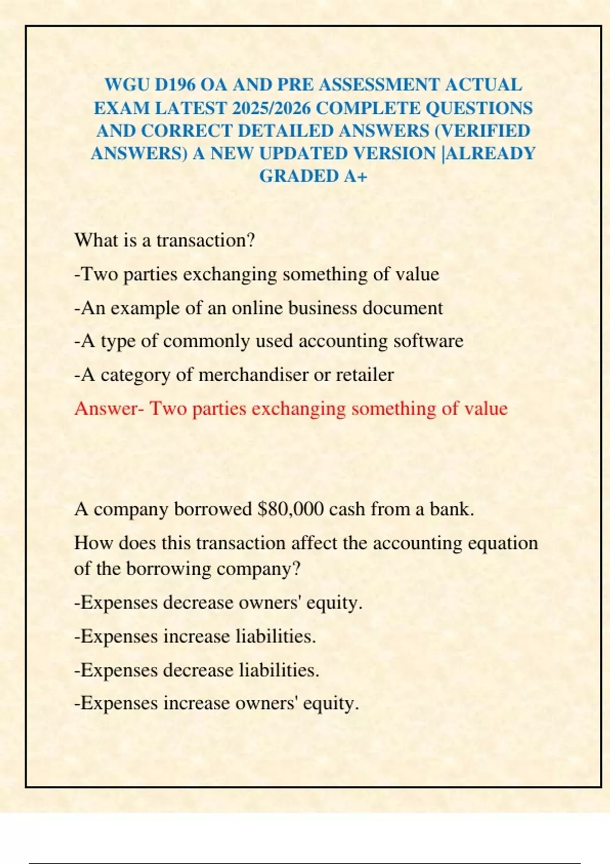 WGU D196 OA AND PRE ASSESSMENT ACTUAL EXAM LATEST 2025/2026 COMPLETE QUESTIONS AND CORRECT DETAILED ANSWERS (VERIFIED ANSWERS) A NEW UPDATED VERSION |ALREADY GRADED A+
