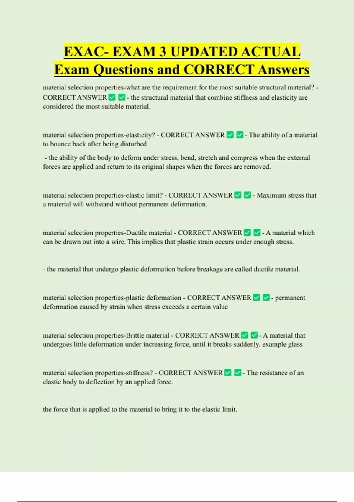 EXAC- EXAM 3 UPDATED ACTUAL Exam Questions and CORRECT Answers material selection properties-what are the requirement for the most suitable structural material? - CORRECT ANSWER - the structural material that combine stiffness and elasticity are considered the most suitable material. material selection properties-elasticity? - CORRECT ANSWER to bounce back after being disturbed - The ability of a material - the ability of the body to deform under stress, bend, stretch and compress wh