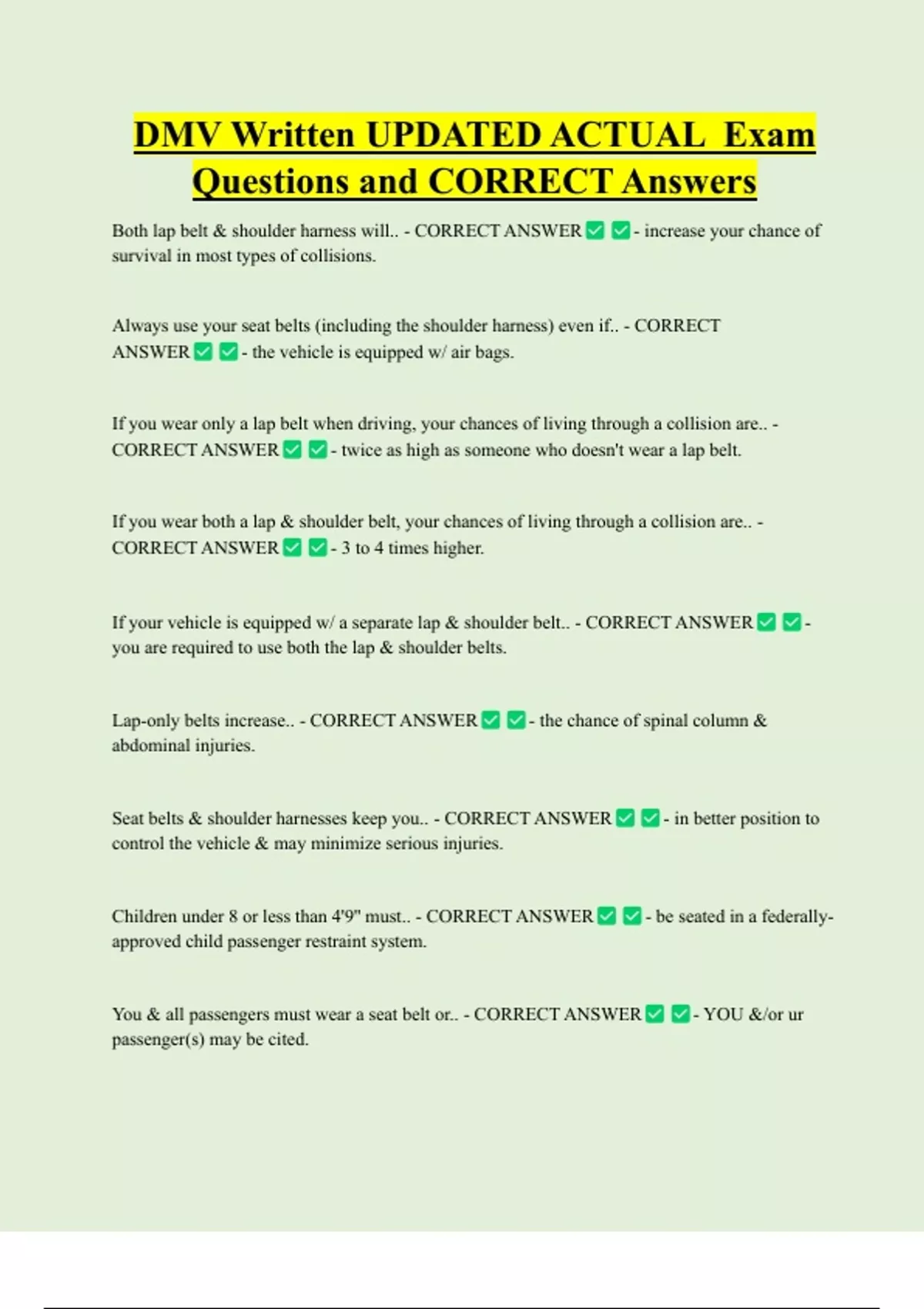 DMV Written UPDATED ACTUAL Exam Questions and CORRECT Answers Both lap belt & shoulder harness will.. - CORRECT ANSWER survival in most types of collisions. - increase your chance of Always use your seat belts (including the shoulder harness) even if.. - CORRECT ANSWER - the vehicle is equipped w/ air bags