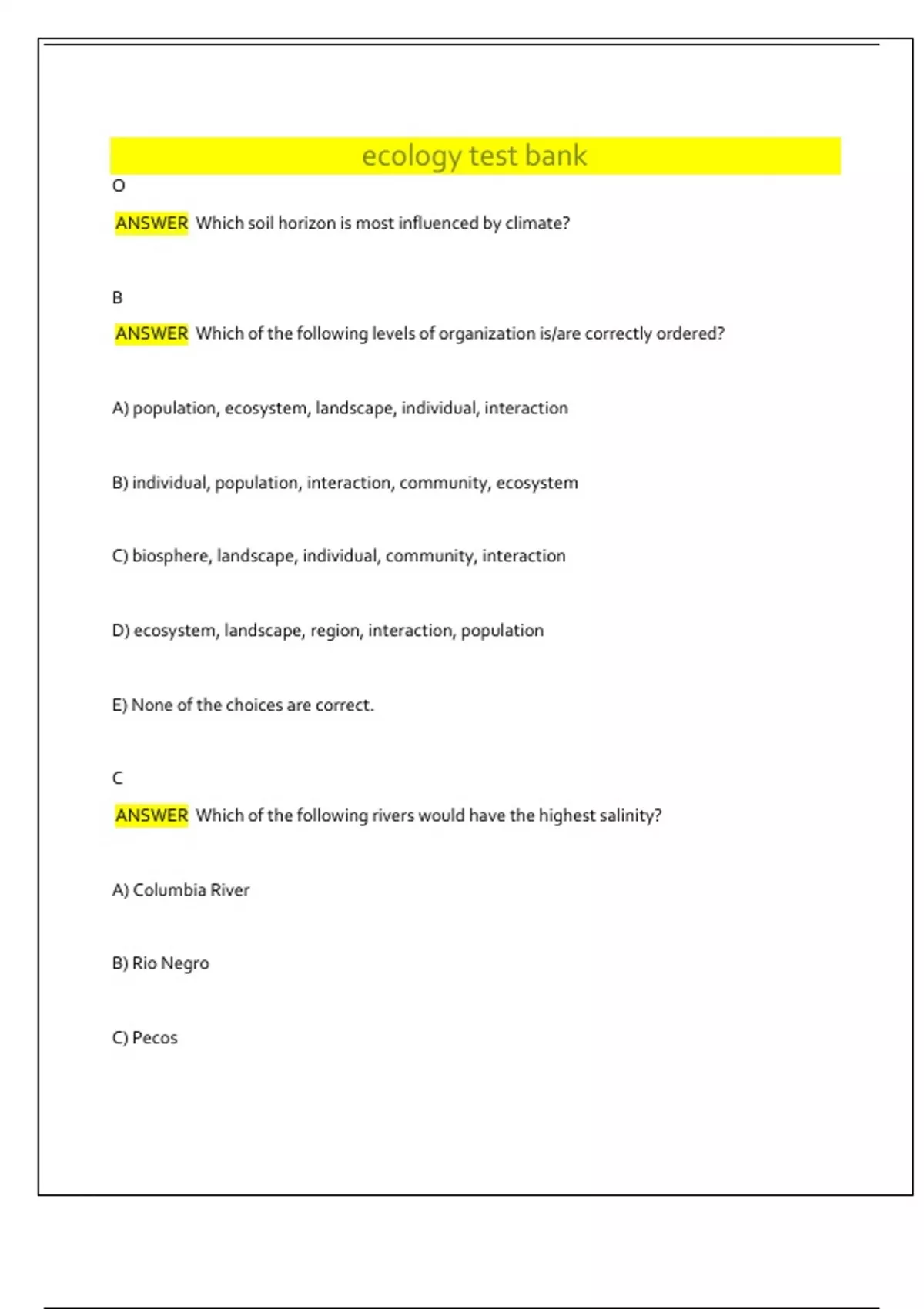 O ANSWER Which soil horizon is most influenced by climate? B ANSWER Which of the following levels of organization is/are correctly ordered? A) population, ecosystem, landscape, individual, interaction B) individual, population, interaction, community, ecosystem C) biosphere, landscape, individual, community, interaction D) ecosystem, landscape, region, interaction, population E) None of the choices are correct. C ANSWER Which of the following rivers would have the highest salinity? A) Columbia River B) Rio Negro C) Pecos