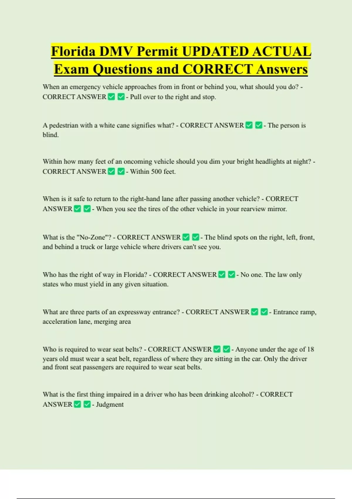 Florida DMV Permit UPDATED ACTUAL Exam Questions and CORRECT Answers