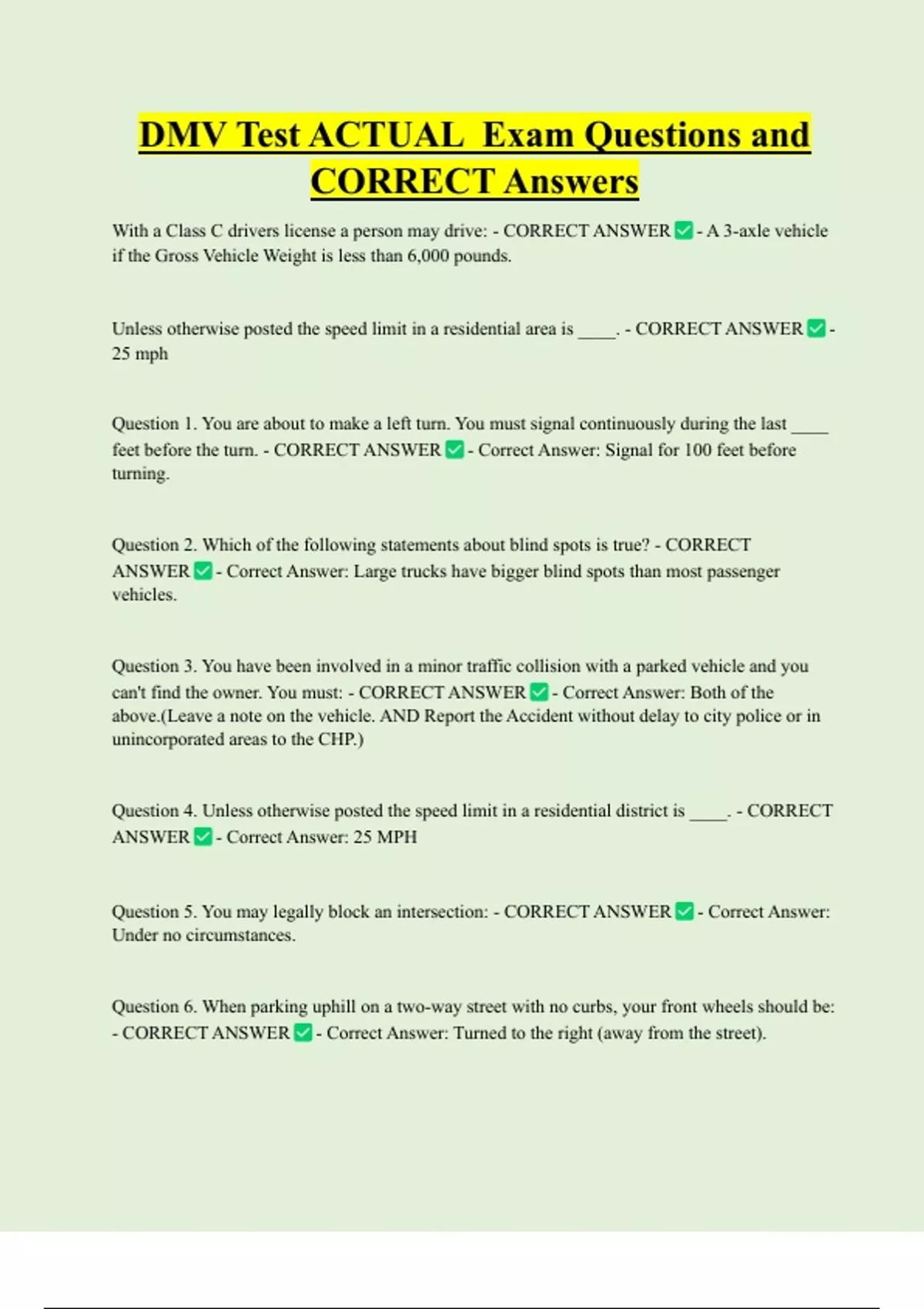 DMV Test ACTUAL Exam Questions and CORRECT Answers With a Class C drivers license a person may drive: - CORRECT ANSWER - A 3-axle vehicle if the Gross Vehicle Weight is less than 6,000 pounds. Unless otherwise posted the speed limit in a residential area is ____. - CORRECT ANSWER 25 mph