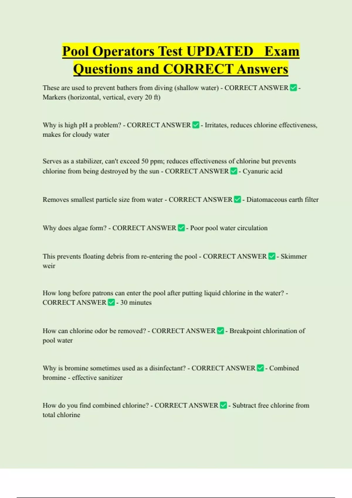Pool Operators Test UPDATED Exam Questions and CORRECT Answers These are used to prevent bathers from diving (shallow water) - CORRECT ANSWER Markers (horizontal, vertical, every 20 ft) - Why is high pH a problem? - CORRECT ANSWER - Irritates, reduces chlorine effectiveness, makes for cloudy water