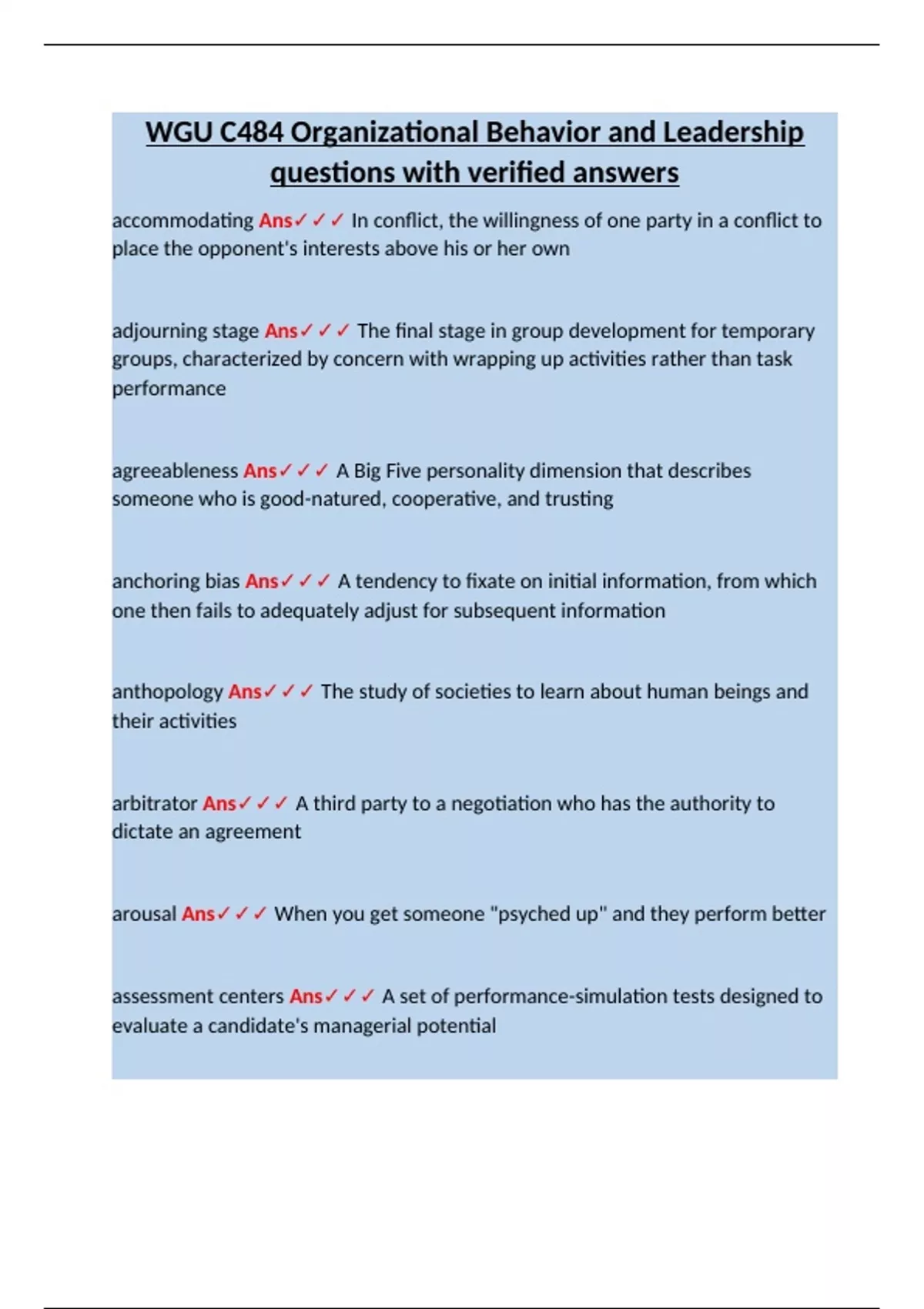 WGU C484 Organizational Behavior and Leadership questions with verified answers