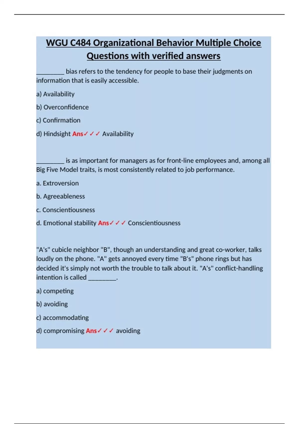 WGU C484 Organizational Behavior Multiple Choice Questions with verified answers.