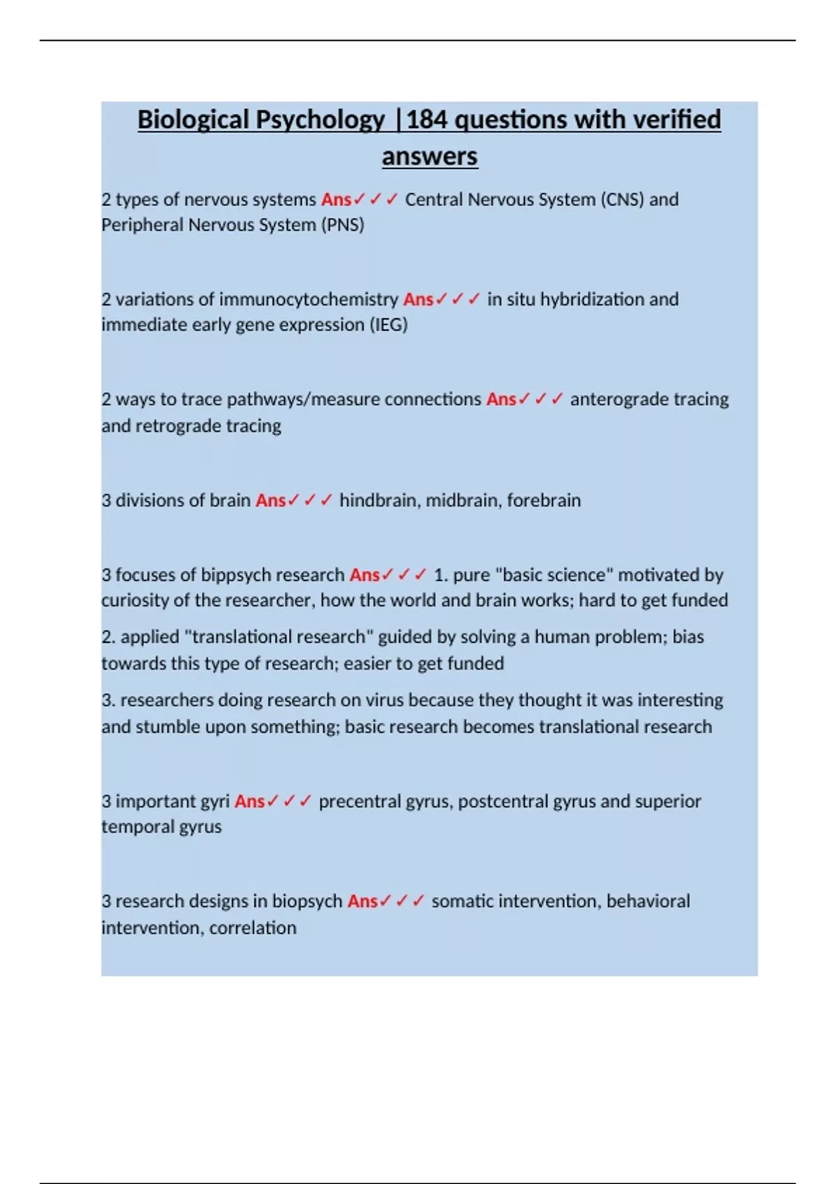 2 types of nervous systems Ans Central Nervous System (CNS) and Peripheral Nervous System (PNS) 2 variations of immunocytochemistry Ans in situ hybridization and immediate early gene expression (IEG) 2 ways to trace pathways/measure connections Ans anterograde tracing and retrograde tracing 3 divisions of brain Ans hindbrain, midbrain, forebrain 3 focuses of bippsych research Ans 1. pure "basic science" motivated by curiosity of the researcher, how the world and brain works; hard to get funded 2. applied "translational research" guided by solving a human problem; bias towards this type of research; easier to get funded 3. researchers doing research on virus because they thought it was interesting and stumble upon something; basic research becomes translational research 3 important gyri Ans precentral gyrus, postcentral gyrus and superior temporal gyrus 3 research designs in biopsych Ans somatic
