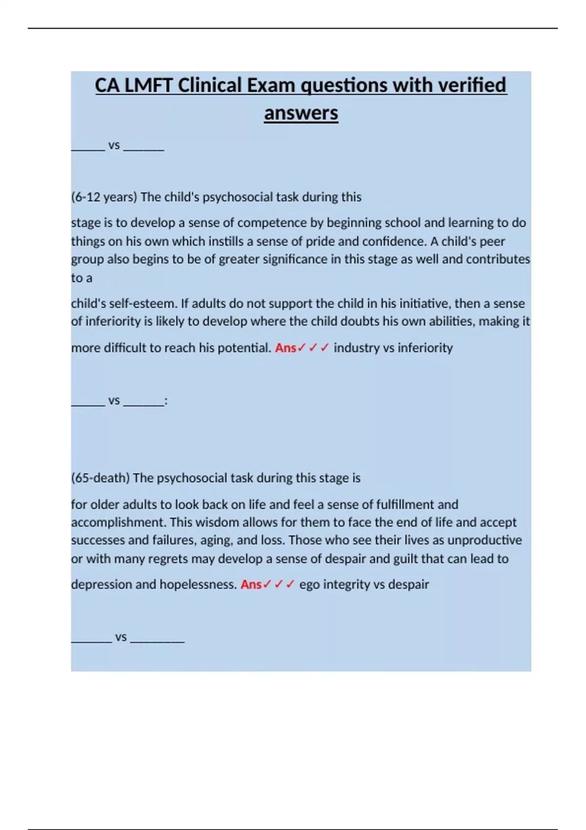 and a sense of uselessness or rejection. Ans✓✓✓ generativity vs stagnation