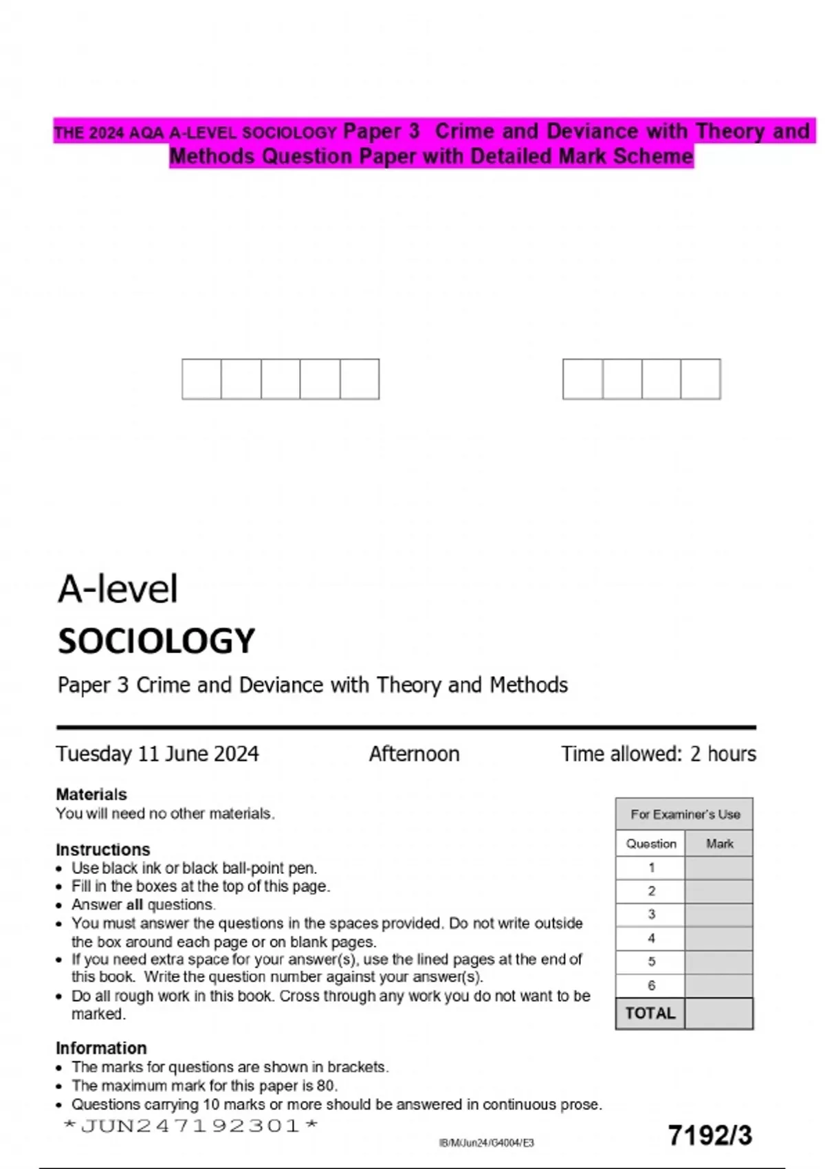 THE 2024 AQA A-LEVEL SOCIOLOGY Paper 3 Crime and Deviance with Theory and Methods Question Paper with Detailed Mark Scheme