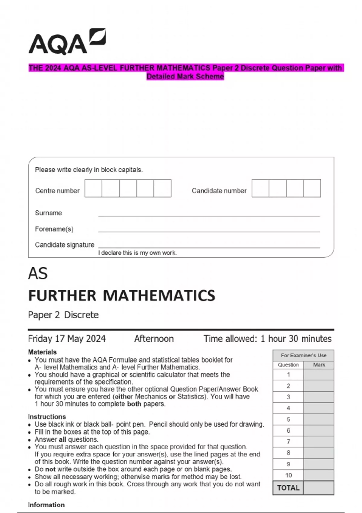 THE 2024 AQA AS-LEVEL FURTHER MATHEMATICS Paper 2 Discrete Question Paper with Detailed Mark Scheme