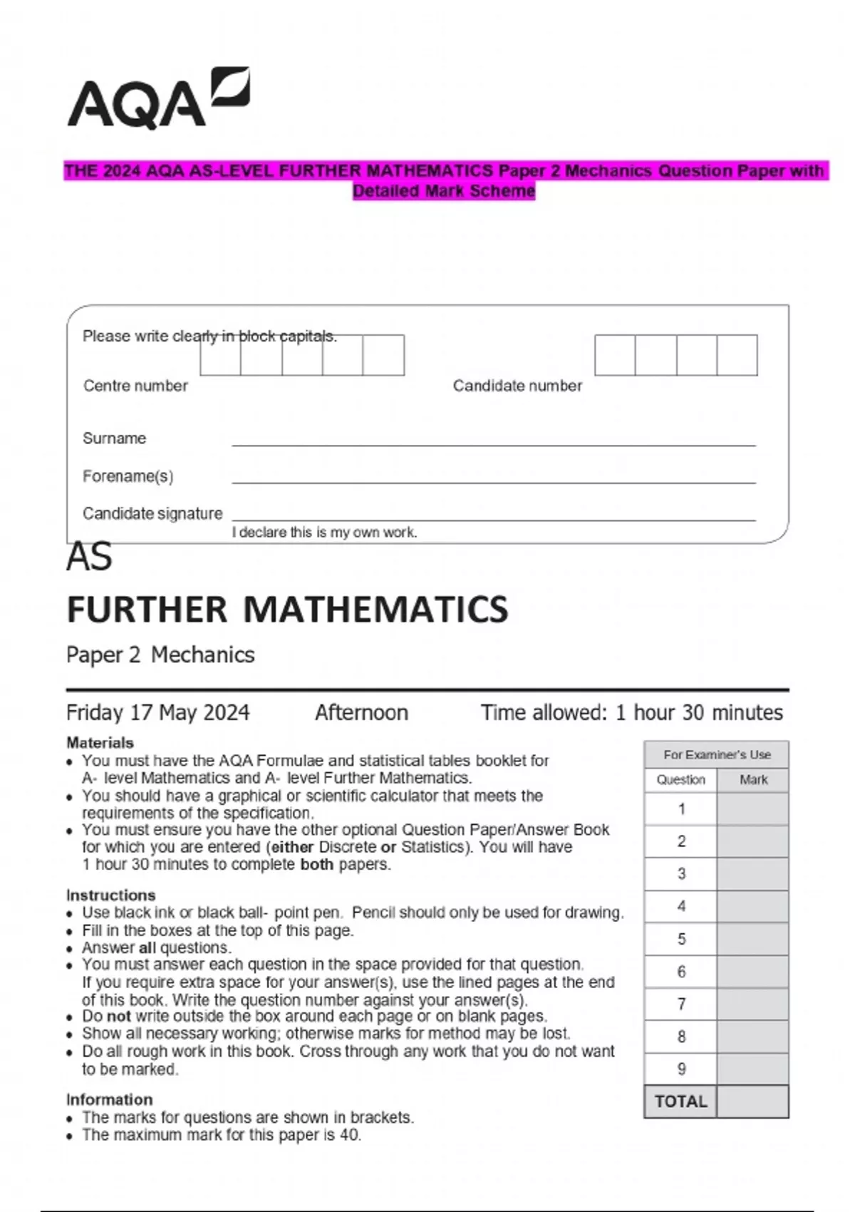 THE 2024 AQA AS-LEVEL FURTHER MATHEMATICS Paper 2 Mechanics Question Paper with Detailed Mark Scheme