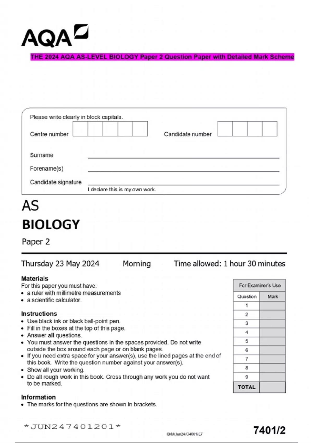 THE 2024 AQA AS-LEVEL BIOLOGY Question Paper with Detailed Mark Scheme