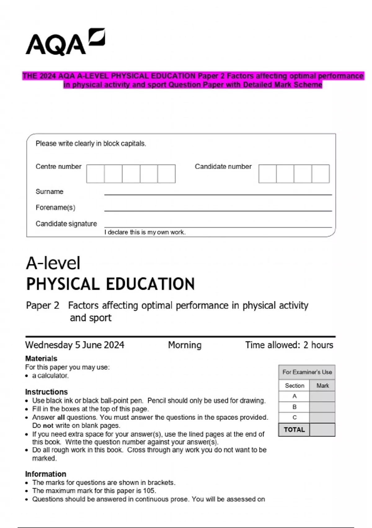 THE 2024 AQA A-LEVEL PHYSICAL EDUCATION Paper 2 Factors affecting optimal performance in physical activity and sport Question Paper with Detailed Mark Scheme