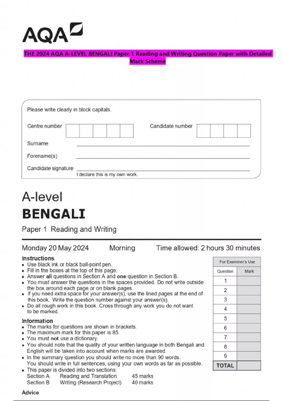THE 2024 AQA A-LEVEL BENGALI Paper 1 Reading and Writing Question Paper with Detailed Mark Scheme