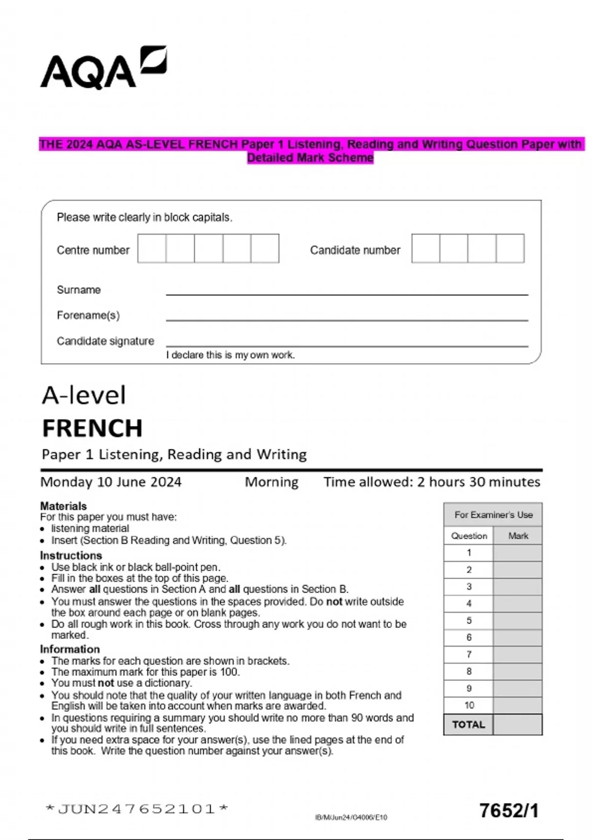 THE 2024 AQA AS-LEVEL FRENCH Paper 1 Listening, Reading and Writing Question Paper with Detailed Mark Scheme