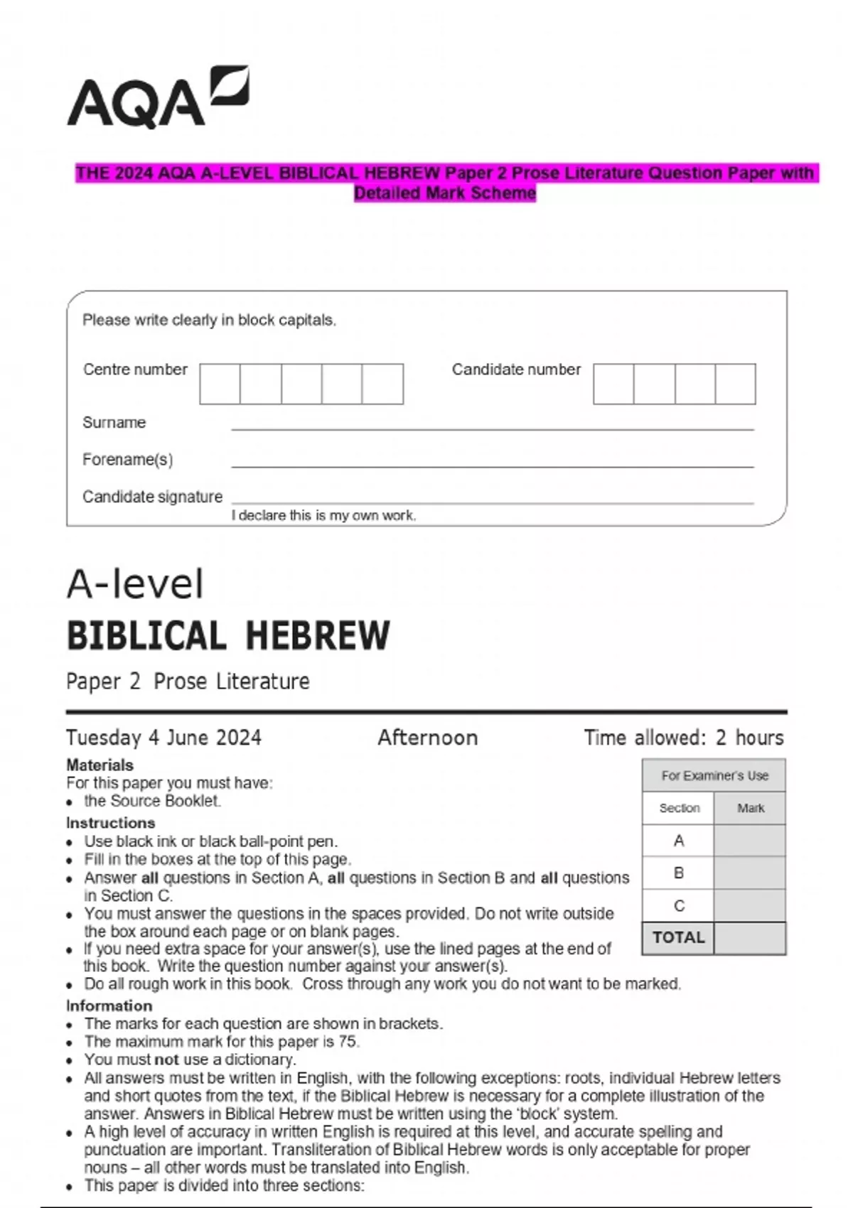 THE 2024 AQA A-LEVEL BIBLICAL HEBREW Paper 2 Prose Literature Question Paper with Detailed Mark Scheme