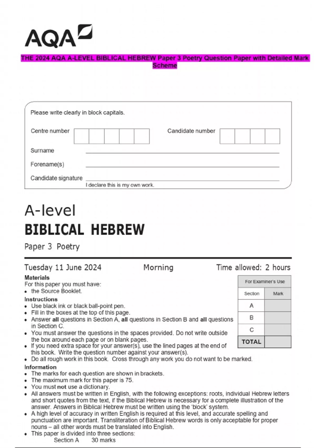 THE 2024 AQA A-LEVEL BIBLICAL HEBREW Paper 3 Poetry Question Paper with Detailed Mark Scheme