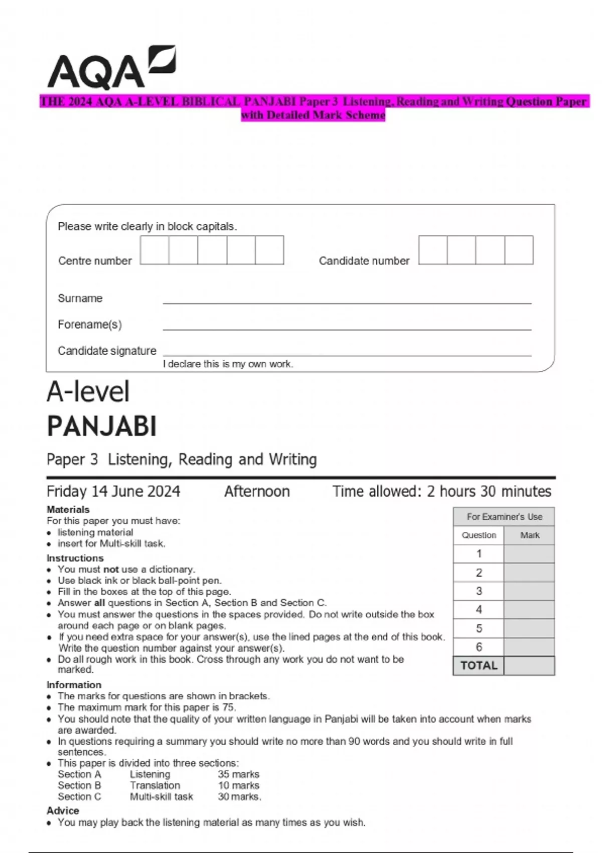 THE 2024 AQA A-LEVEL BIBLICAL PANJABI Paper 3 Listening, Reading and Writing Question Paper with Detailed Mark Scheme