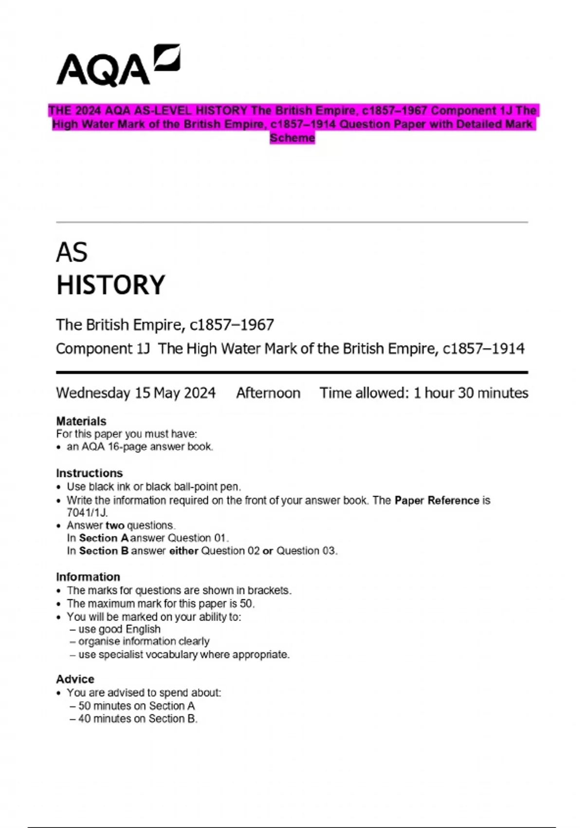 THE 2024 AQA AS-LEVEL HISTORY The British Empire, c1857–1967 Component 1J The High Water Mark of the British Empire, c1857–1914 Question Paper with Detailed Mark Scheme