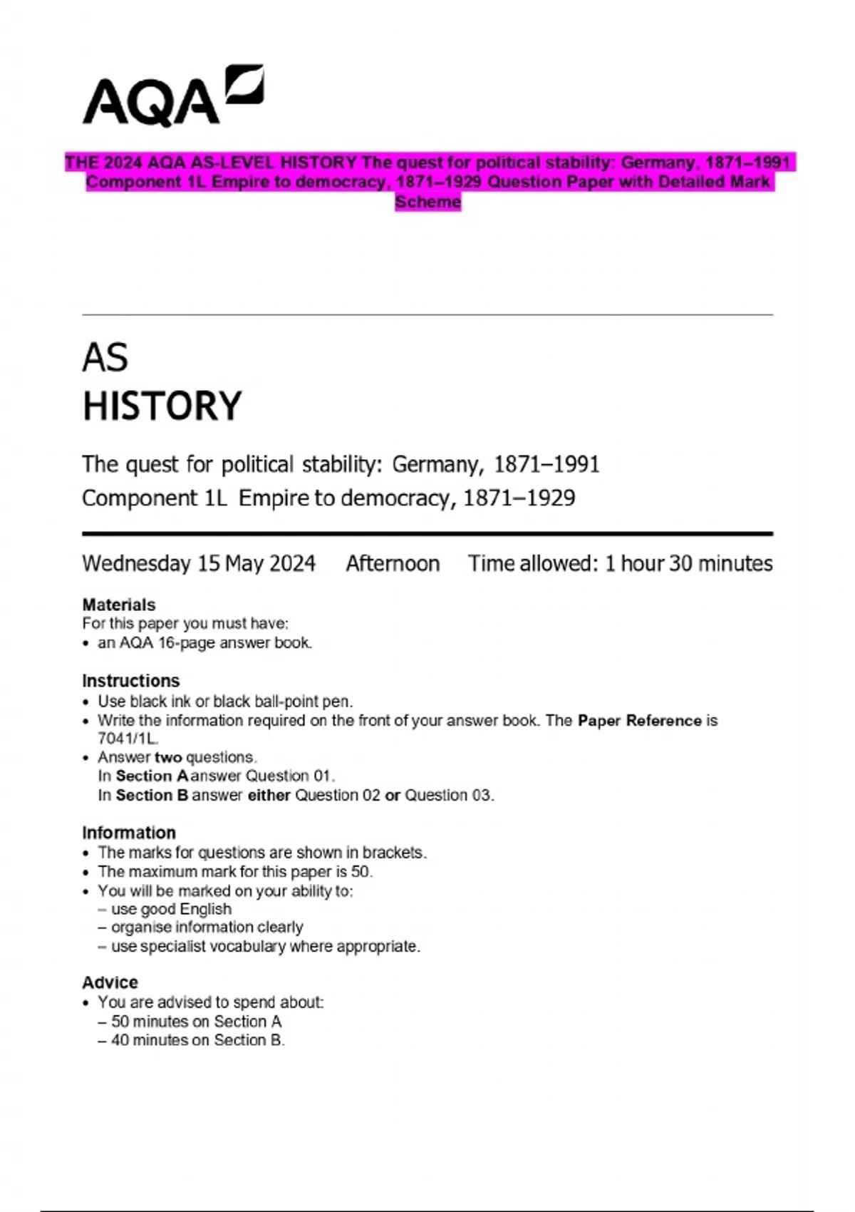 THE 2024 AQA AS-LEVEL HISTORY The quest for political stability: Germany, 1871–1991 Component 1L Empire to democracy, 1871–1929 Question Paper with Detailed Mark Scheme