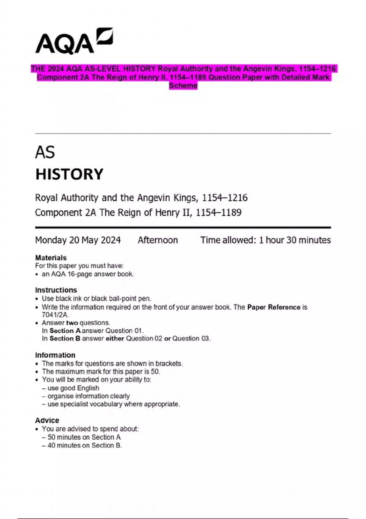 THE 2024 AQA AS-LEVEL HISTORY Royal Authority and the Angevin Kings, 1154–1216 Component 2A The Reign of Henry II, 1154–1189 Question Paper with Detailed Mark Scheme