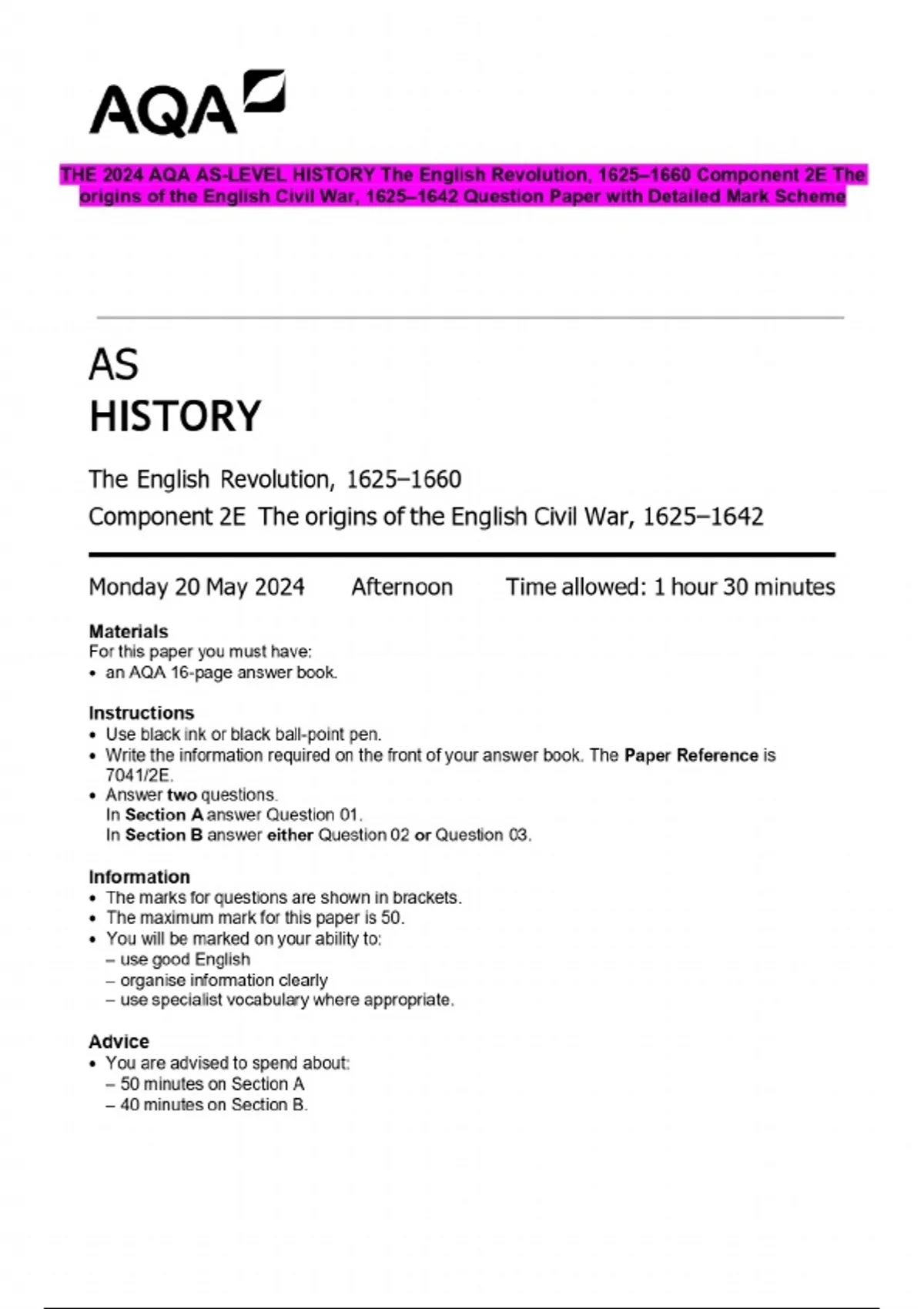 THE 2024 AQA AS-LEVEL HISTORY The English Revolution, 1625–1660 Component 2E The origins of the English Civil War, 1625–1642 Question Paper with Detailed Mark Scheme