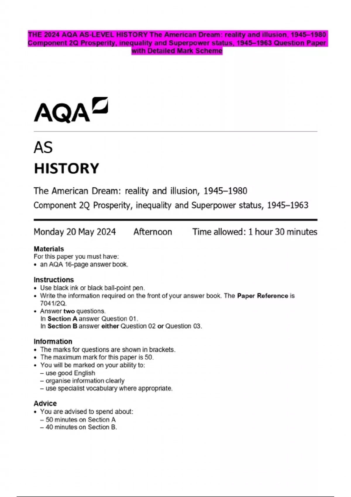 THE 2024 AQA AS-LEVEL HISTORY The American Dream: reality and illusion, 1945–1980 Component 2Q Prosperity, inequality and Superpower status, 1945–1963 Question Paper with Detailed Mark Scheme