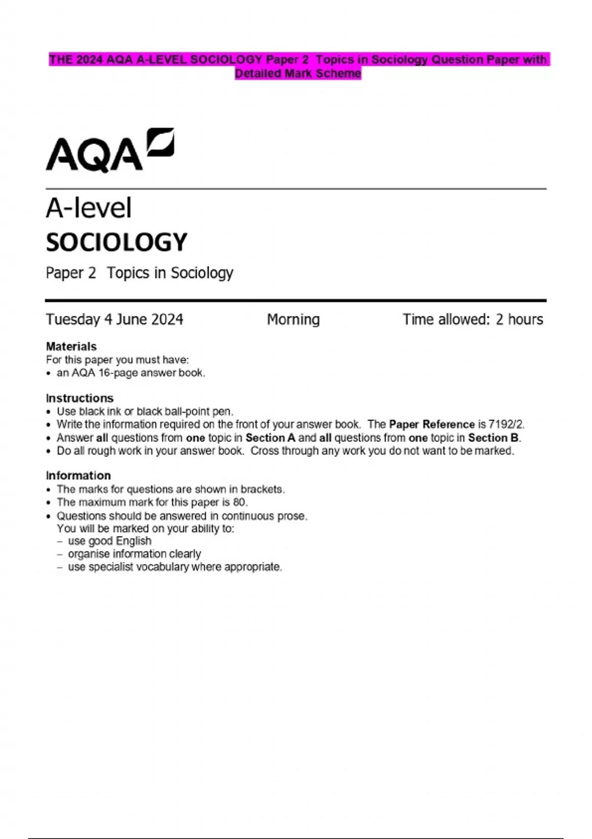 THE 2024 AQA A-LEVEL SOCIOLOGY Paper 2 Topics in Sociology Question Paper with Detailed Mark Scheme