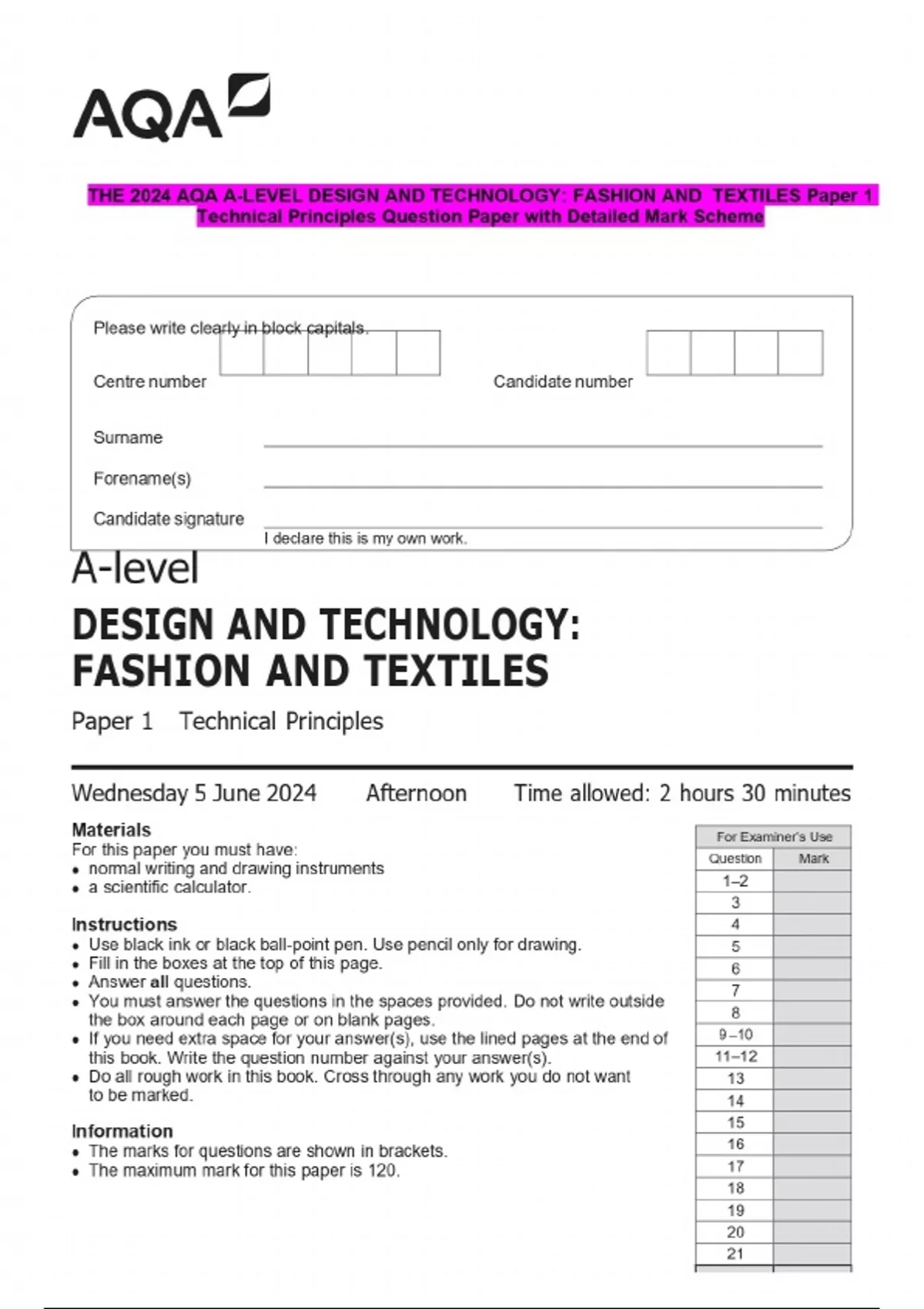 THE 2024 AQA A-LEVEL DESIGN AND TECHNOLOGY: FASHION AND TEXTILES Paper 1 Technical Principles Question Paper with Detailed Mark Scheme
