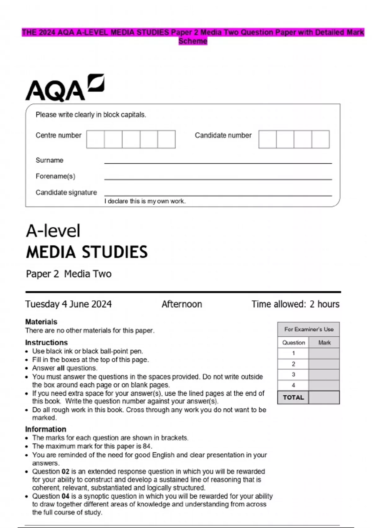THE 2024 AQA A-LEVEL MEDIA STUDIES Paper 2 Media Two Question Paper with Detailed Mark Scheme