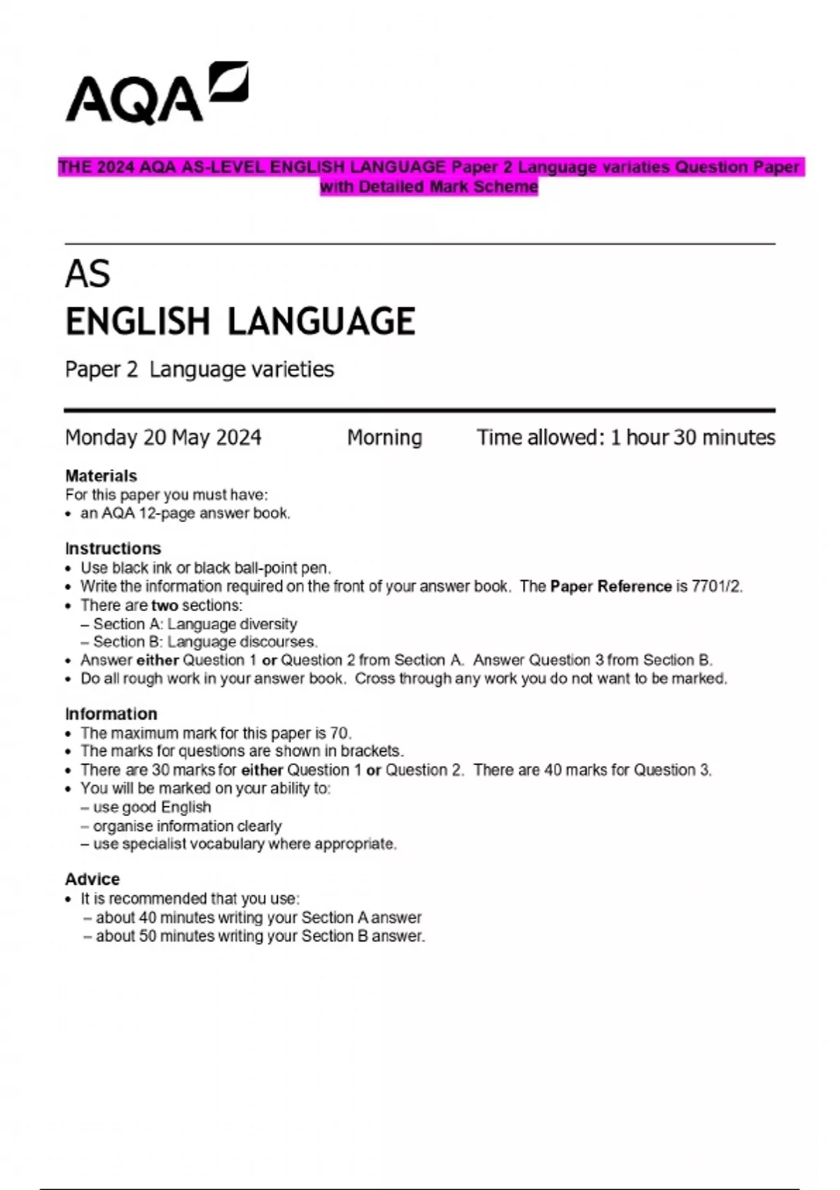 THE 2024 AQA AS-LEVEL ENGLISH LANGUAGE Paper 2 Language variaties Question Paper with Detailed Mark Scheme