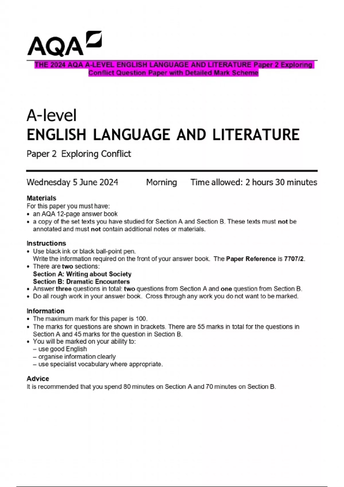 THE 2024 AQA A-LEVEL ENGLISH LANGUAGE AND LITERATURE Paper 2 Exploring Conflict Question Paper with Detailed Mark Scheme