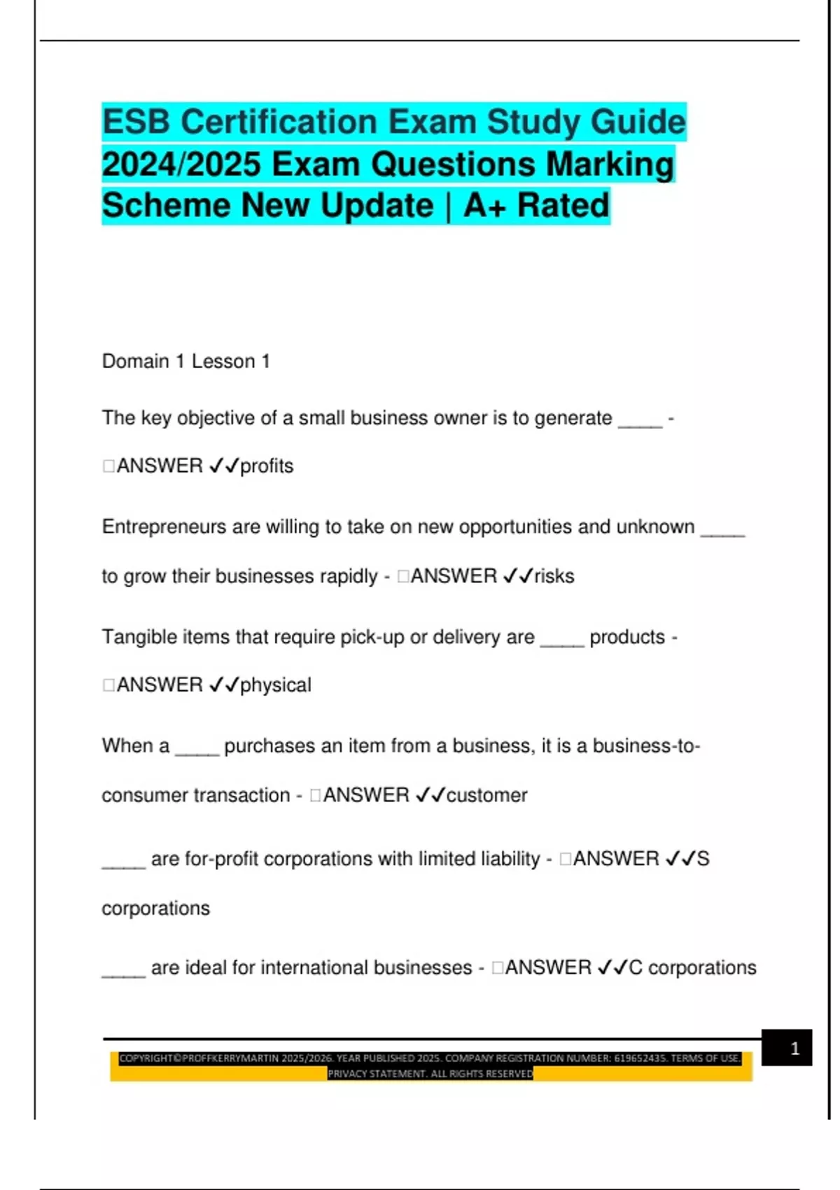 ESB Certification Exam Study Guide 2024/2025 Exam Questions Marking Scheme New Update | A+ Rated Domain 1 Lesson 1 The key objective of a small business owner is to generate ____ - � �ANSWER profits Entrepreneurs are willing to take on new opportunities and unknown ____ to grow their businesses rapidly -