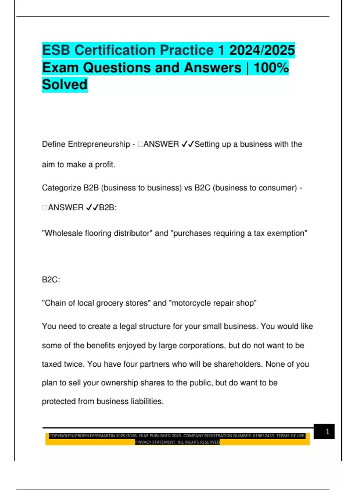 ESB Certification Practice 1 2024/2025 Exam Questions and Answers | 100% Solved Define Entrepreneurship -