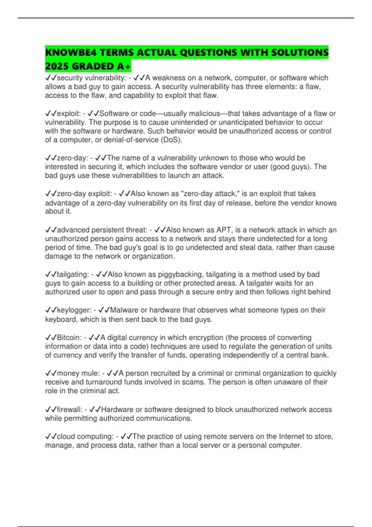 ✔✔security vulnerability: - ✔✔A weakness on a network, computer, or software which