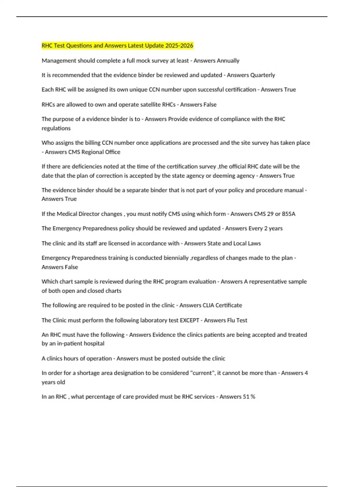 RHC Test Questions and Answers Latest Update Management should complete a full mock survey at least - Answers Annually It is recommended that the evidence binder be reviewed and updated - Answers Quarterly Each RHC will be assigned its own unique CCN number upon successful certification - Answers True RHCs are allowed to own and operate satellite RHCs - Answers False The purpose of a evidence binder is to - Answers Provide evidence of compliance with the RHC regulations Who assigns the billing CCN number once applications are processed and the site survey has taken place - Answers CMS Regional Office If there are deficiencies noted at the time of the certification survey ,the official RHC date will be the date that the plan of correction is accepted by the state agency or deeming agency - Answers True The evidence binder should be a separate binder that is not part of your policy and procedure manual - Answers True If the Medical Director changes , you must notify CMS using which form - Answers CMS 29 or 855A The Emergency Preparedness policy should be reviewed and updated - Answers Every 2 years The clinic and its staff are licensed in accordance with - Answers State and Local Laws Emergency Preparedness training is conducted biennially ,regardless of changes made to the plan - Answers False Which chart sample is reviewed during the RHC program evaluation - Answers A representative sample of both open and closed charts The following are required to be posted in the clinic - Answers CLIA Certificate The Clinic must perform the following laboratory test EXCEPT - Answers Flu Test An RHC must have the following - Answers Evidence the clinics patients are being accepted and treated by an in-patient hospital A clinics hours of operation - Answers must be posted outside the clinic In order for a shortage area designation to be considered "current", it cannot be more than - Answers 4 years old In an RHC , what percentage of care provided must be RHC services - Answers 51 % All RHC's must participate in which of the following - Answers One full scale exercise or an additional exercise, which is either a full -scale or tabletop exercise RHC program evaluation is required - Answers Biennially Which below best describes a Full-Scale EP exercise - Answers (A) A fire drill involving reception/front-end staff (C) An exercise involving multiple agencies in a joint operation to enact a disaster event with an after-action analysis Both A and C In which situation is Medicare the secondary payer - Answers When the beneficiary is treated for an injury which is the liability of a 3rd party ( MVA) When the beneficiary is considered working -aged and has the GHP through an employer that employs more than 20 employees When the beneficiary is covered under another government program ( black lung) **All of the above** The Medicare Secondary Payer (MSP) questionnaire should be asked for - Answers Medicare beneficiaries prior to each RHC encounter MSP refers to - Answers When the patient has coverage primary to Medicare When established in 1966 , Medicare paid for - Answers Workers Compensation Federal Black Lung Benefits Veterans Administration Benefits **All other claims ** Patients have no responsibilities for Medicare Secondary Payer reporting - Answers F