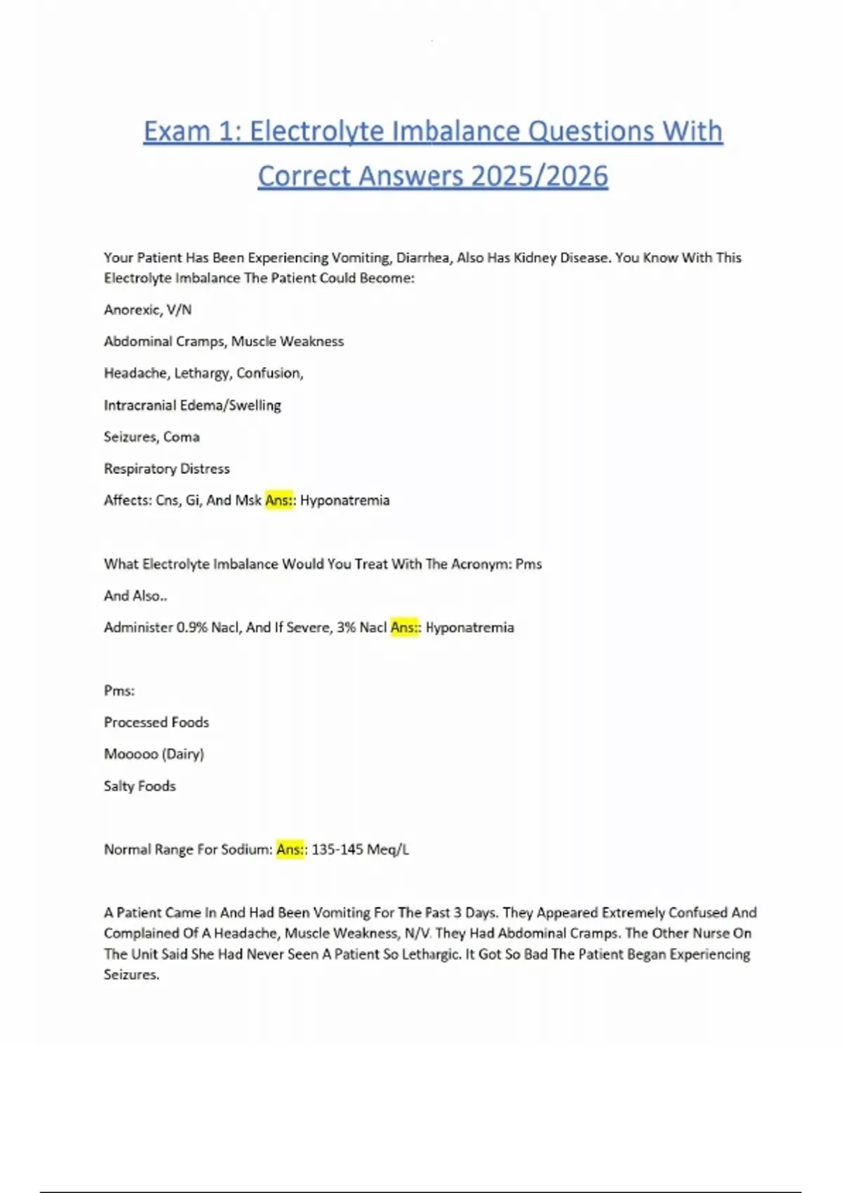Exam 1: Electrolyte Imbalance Questions With Correct Answers 2025/2026 Exam 1: Electrolyte Imbalance Questions With Correct Answers 2025/2026