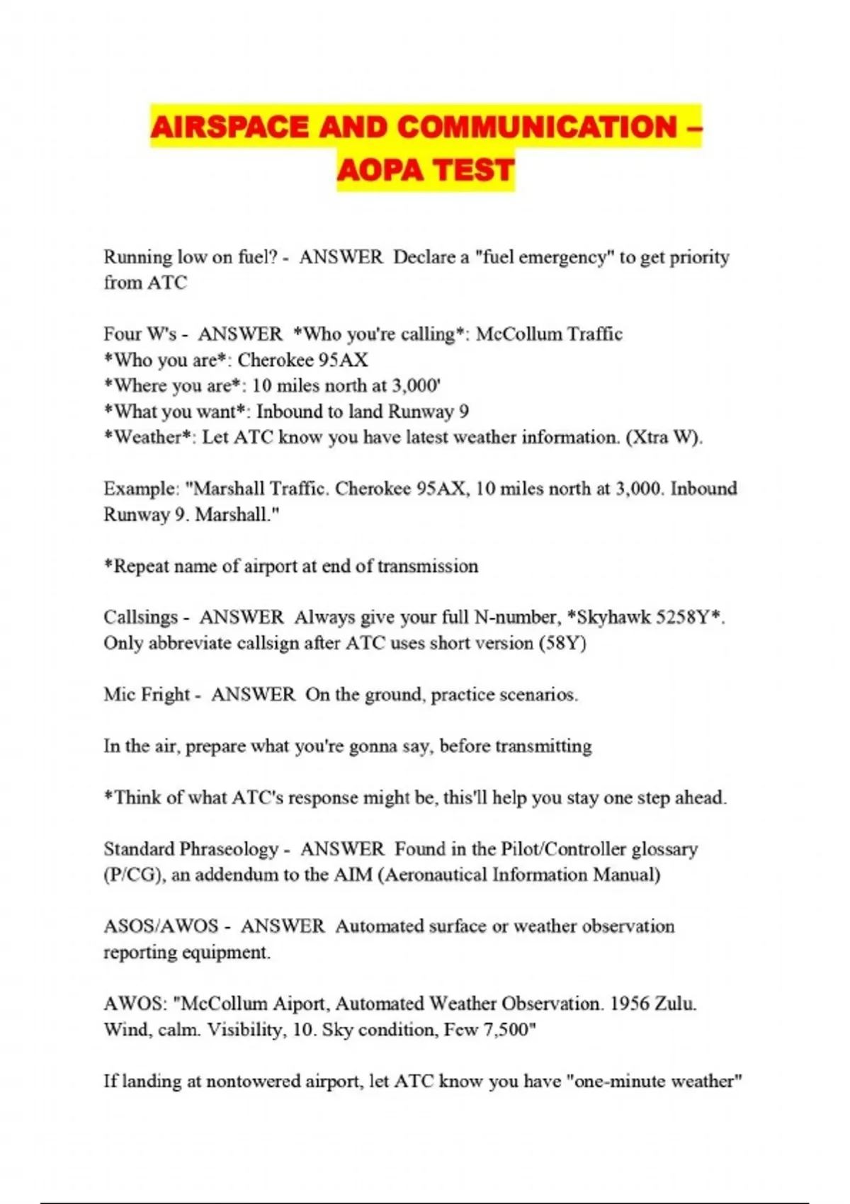 AIRSPACE AND COMMUNICATION – AOPA TEST
