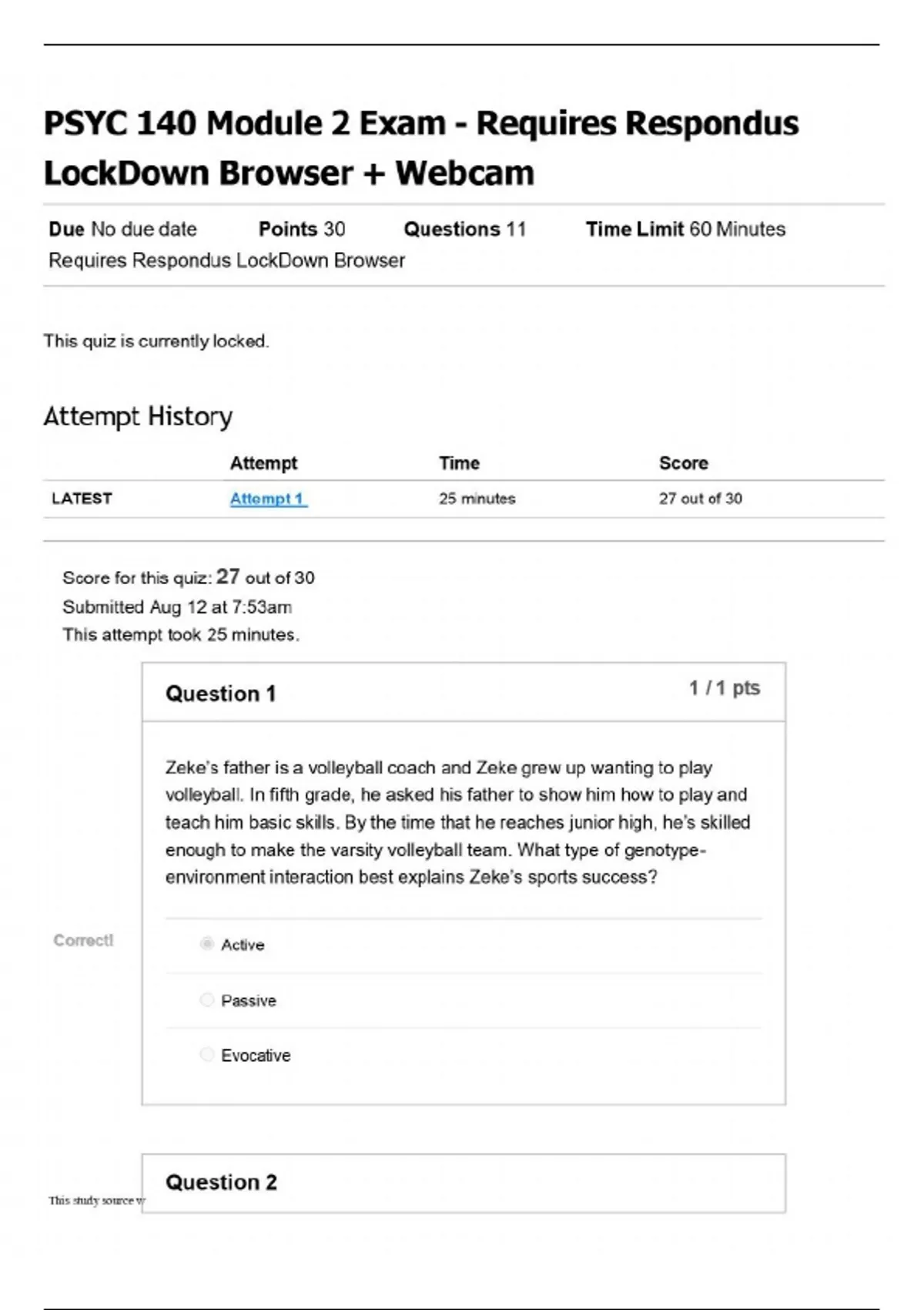 PSYC 140 Module 2 Exam - Requires Respondus LockDown Browser + Webcam |Questions and Answers|2025 Update|100% Correct.