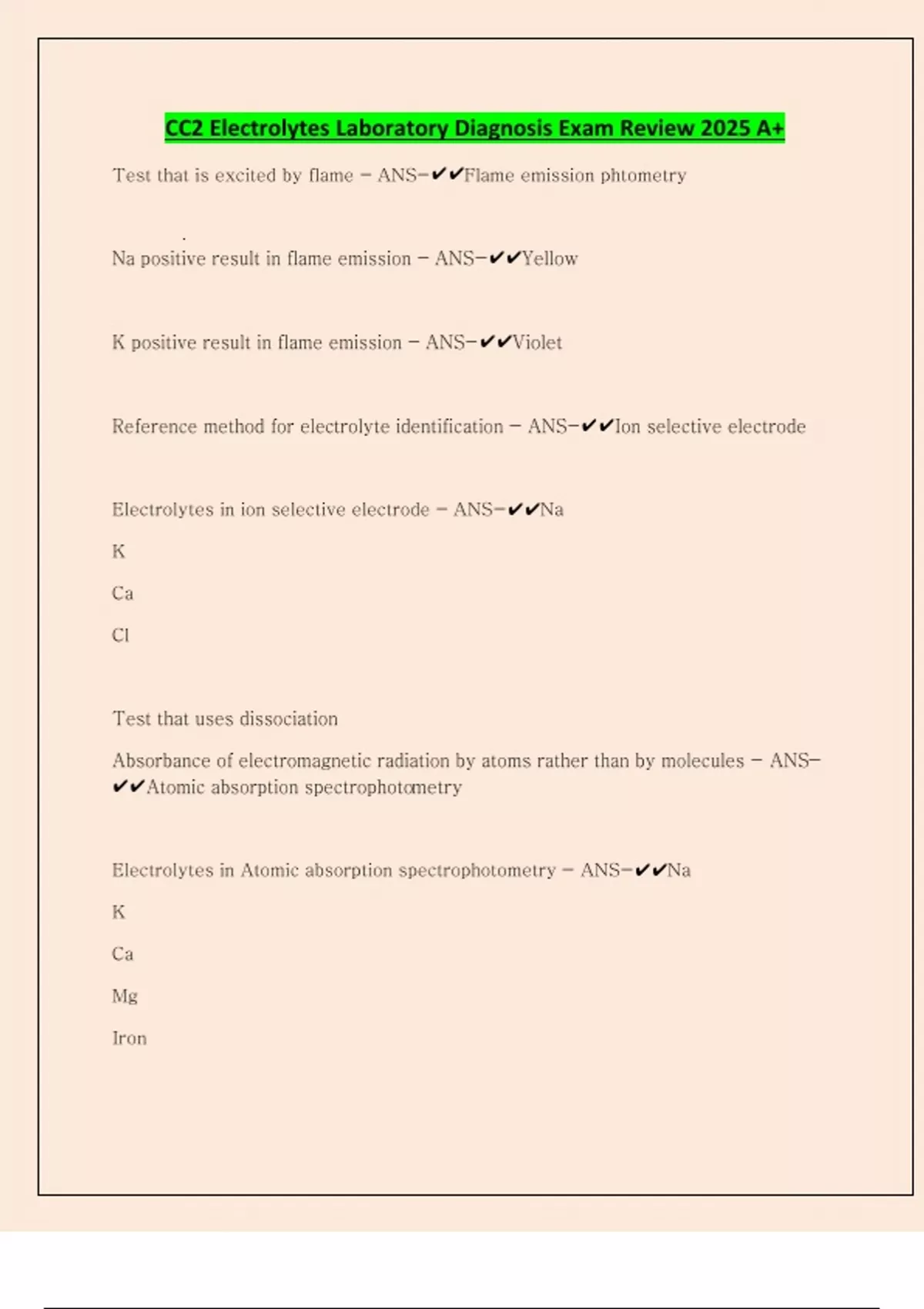 CC2 Electrolytes Laboratory Diagnosis Exam Review 2025 A+ Test that is excited by flame - ANS-Flame emission phtometry Na positive result in flame emission - ANS-Yellow K positive result in flame emission - ANS-Violet Reference method for electrolyte identification - ANS-Ion selective electrode Electrolytes in ion selective electrode - ANS-Na K Ca Cl Test that uses dissociation Absorbance of electromagnetic radiation by atoms rather than by molecules - ANS-Atomic absorption spectrophotometry Electrolytes in Atomic absorption spectrophotometry - ANS-