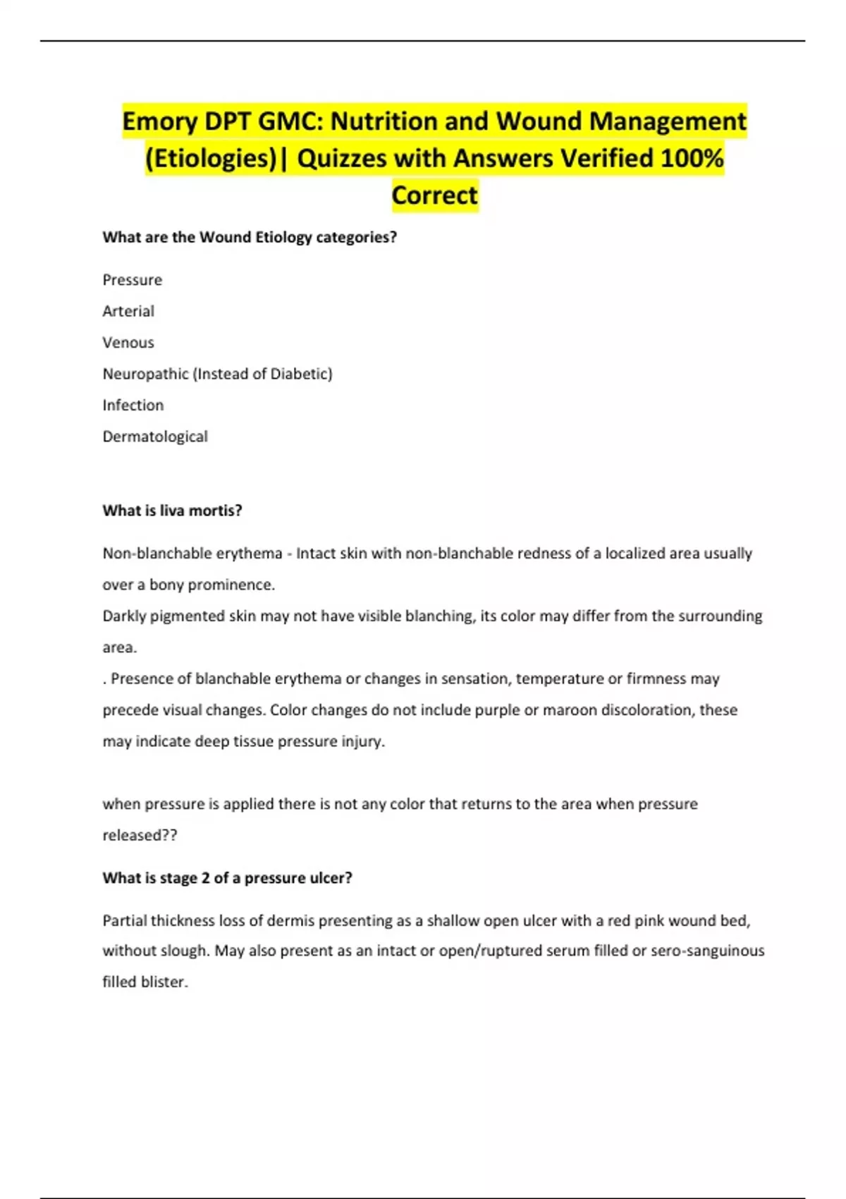 Emory DPT GMC: Nutrition and Wound Management (Etiologies)| Quizzes with Answers Verified 100% Correct