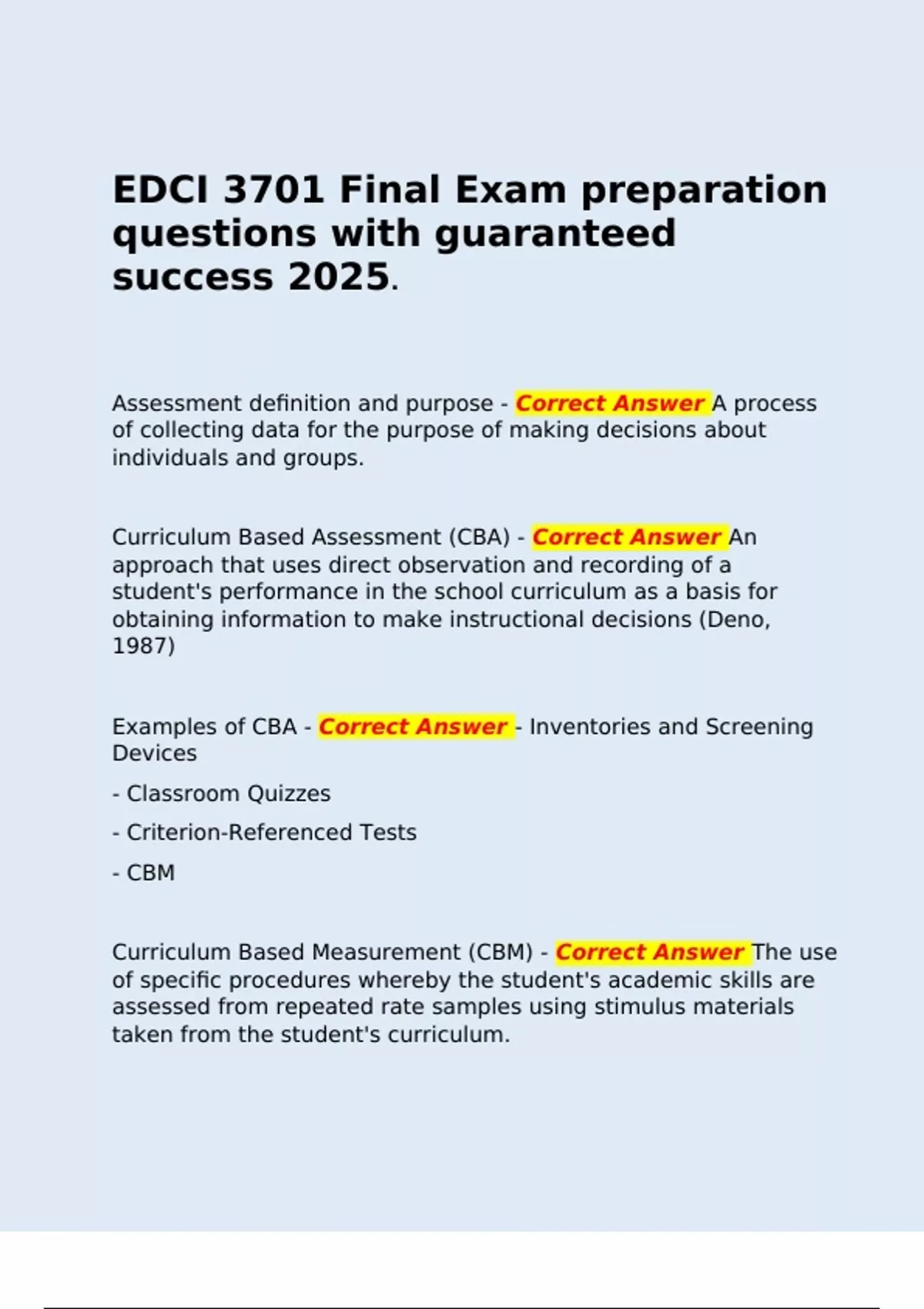 Curriculum Based Assessment (CBA) - Correct Answer An