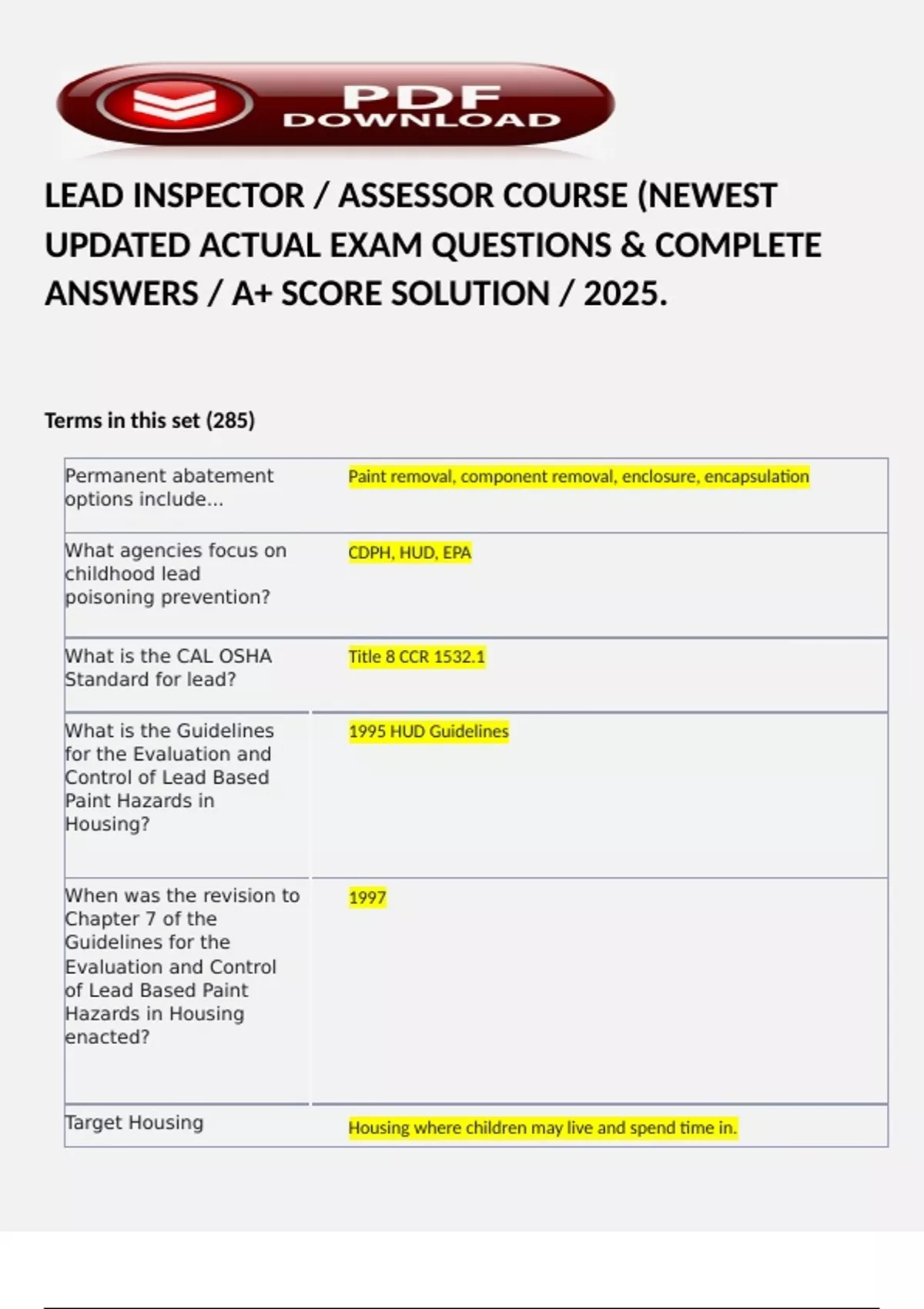 LEAD INSPECTOR / ASSESSOR COURSE (NEWEST UPDATED ACTUAL EXAM QUESTIONS & COMPLETE ANSWERS / A+ SCORE SOLUTION / 2025. Terms in this set (285) Permanent abatement options include... Paint removal, component removal, enclosure, encapsulation What agencies focus on childhood lead poisoning prevention? CDPH, HUD, EPA What is the CAL OSHA Standard for lead? Title 8 CCR 1532.1 What is the Guidelines for the Evaluation and Control of Lead Based Paint Hazards in Housing? 1995 HUD Guidelines When was the revision to Chapter 7 of the Guidelines for the Evaluation and Control of Lead Based Paint Hazards in Housing enacted? 1997