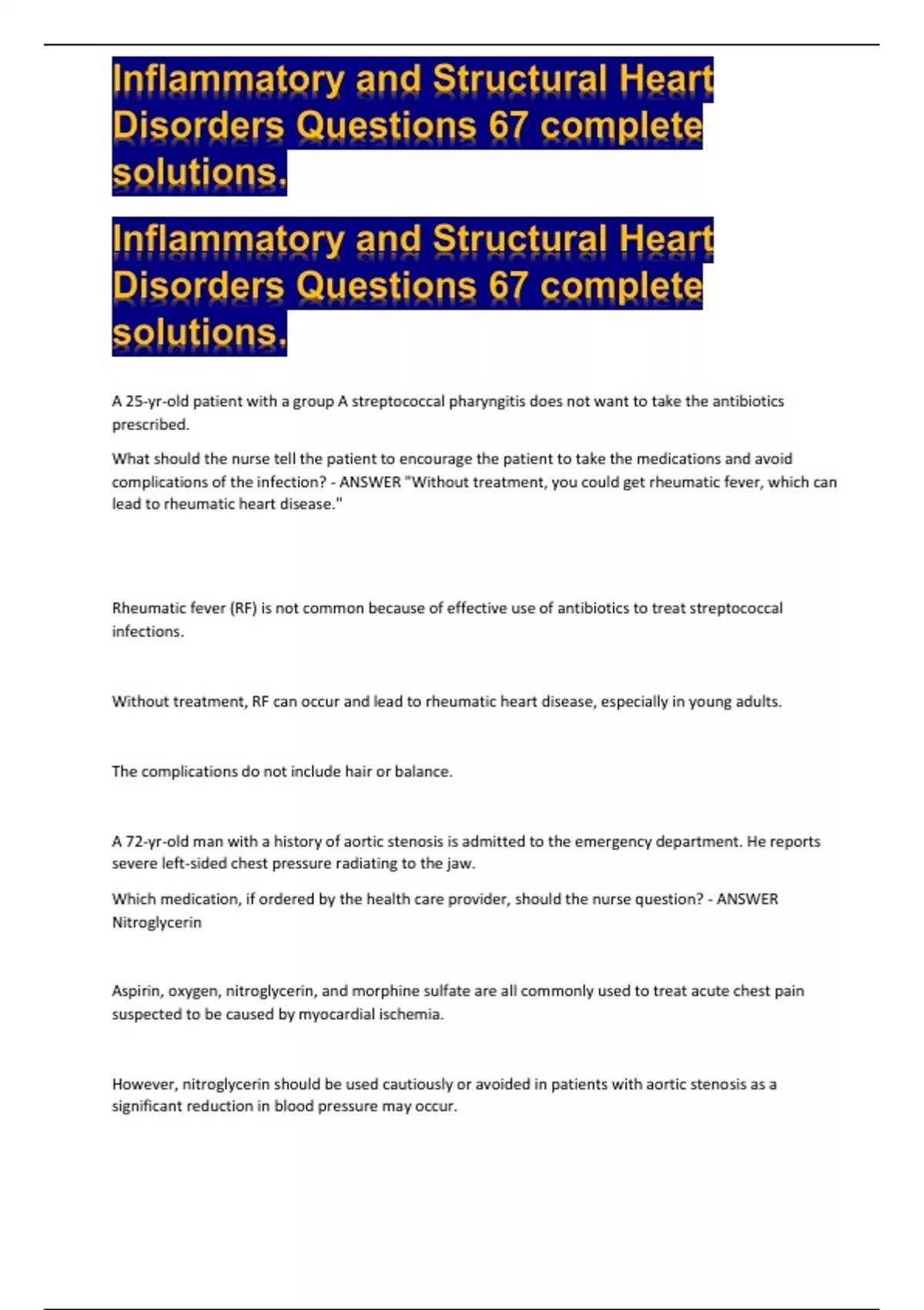 Inflammatory and Structural Heart Disorders Questions 67 complete solutions.