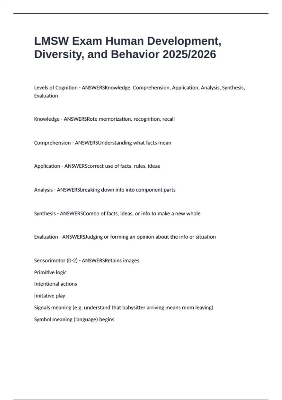 LMSW Exam Human Development, Diversity, and Behavior 2025/2026 Levels of Cognition - ANSWERSKnowledge, Comprehension, Application, Analysis, Synthesis, Evaluation Knowledge - ANSWERSRote memorization, recognition, recall Comprehension - ANSWERSUnderstanding what facts mean Application - ANSWERScorrect use of facts, rules, ideas Analysis - ANSWERSbreaking down info into component parts Synthesis - ANSWERSCombo of facts, ideas, or info to make a new whole Evaluation - ANSWERSJudging or forming an opinion about the info or situation Sensorimotor (0-2) - ANSWERSRetains images Primitive logic Intentional actions Imitative play Signals meaning (e.g. understand that babysitter arriving means mom leaving) Symbol meaning (language) begins