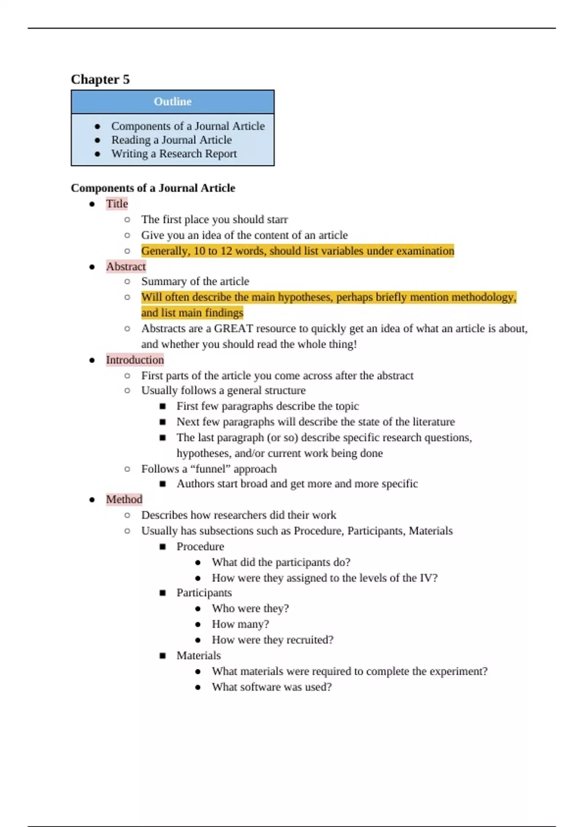 ○ Will often describe the main hypotheses, perhaps briefly mention methodology,