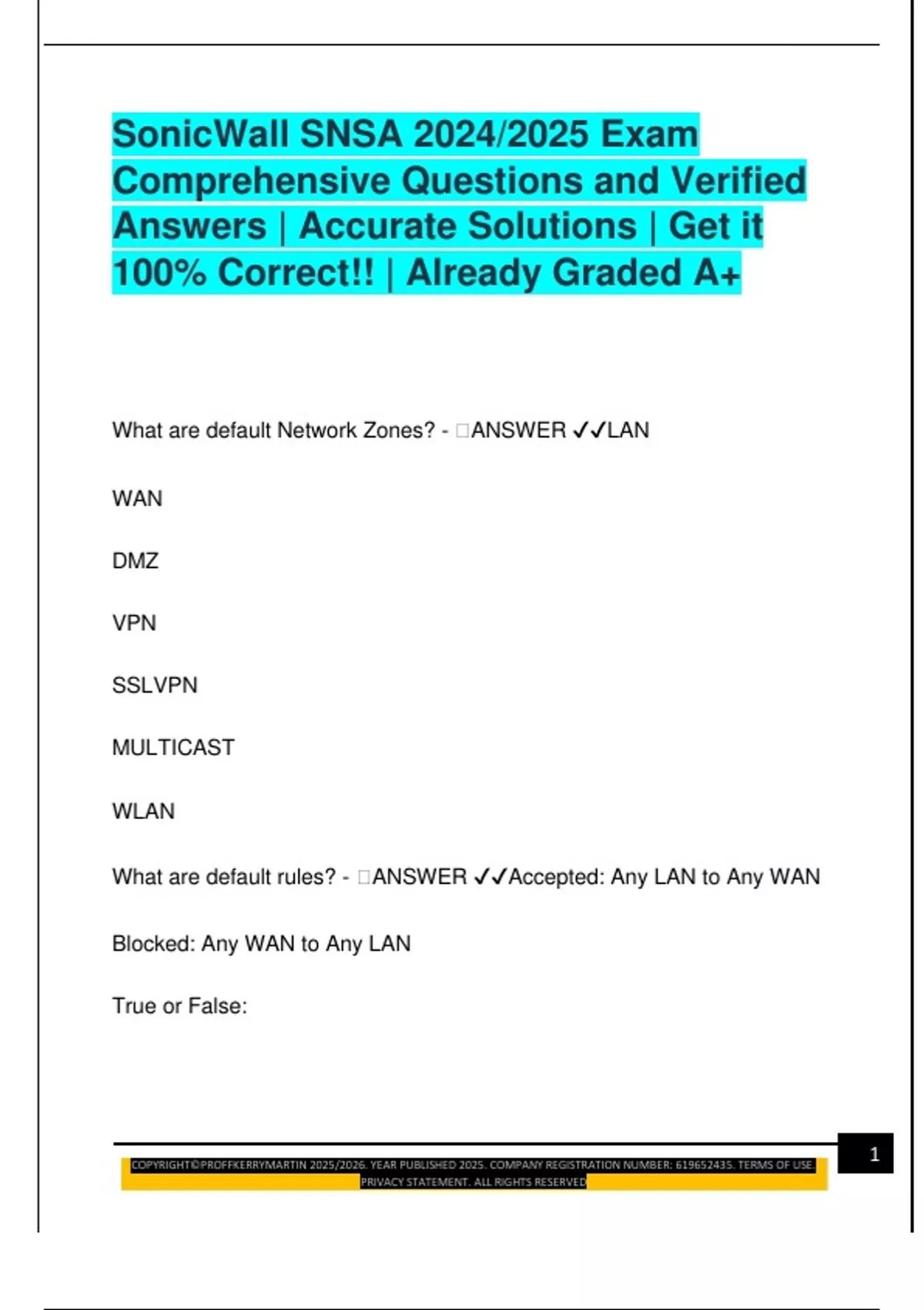 SonicWall SNSA 2024/2025 Exam Comprehensive Questions and Verified Answers | Accurate Solutions | Get it 100% Correct!! | Already Graded A+