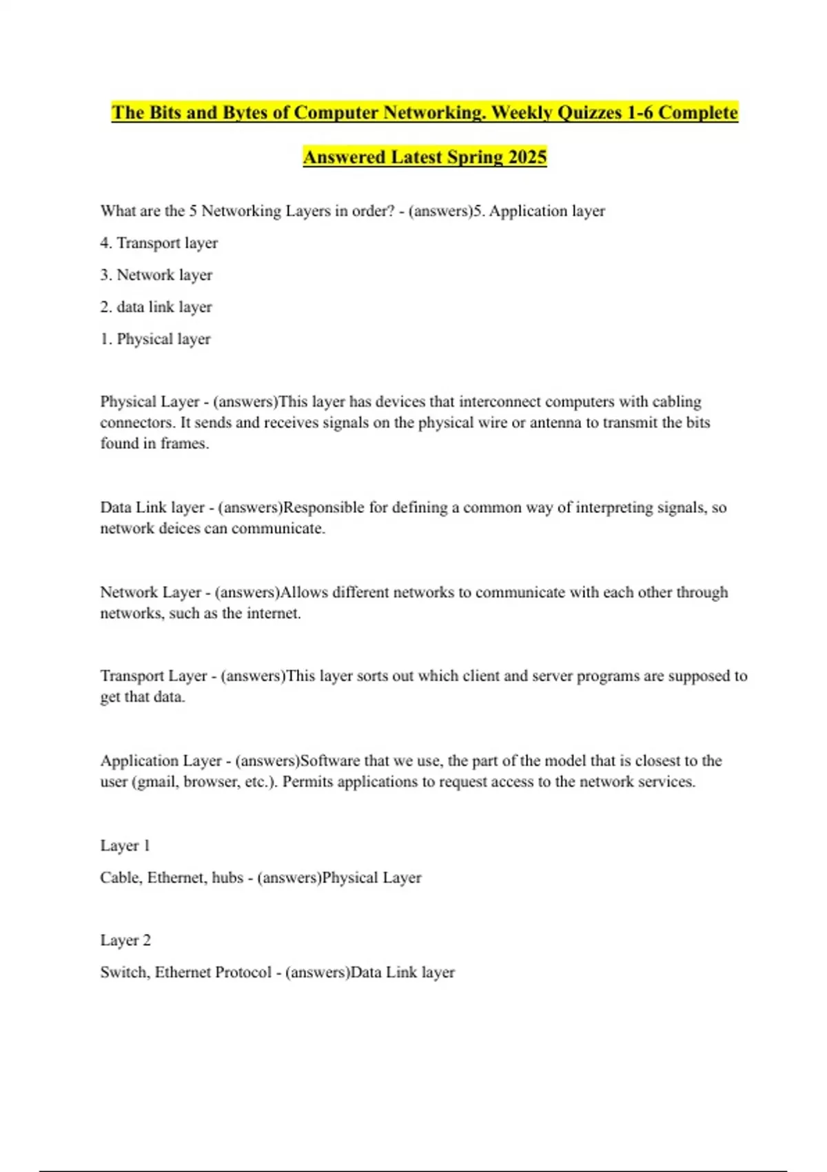 Cable, Ethernet, hubs - (answers)Physical Layer