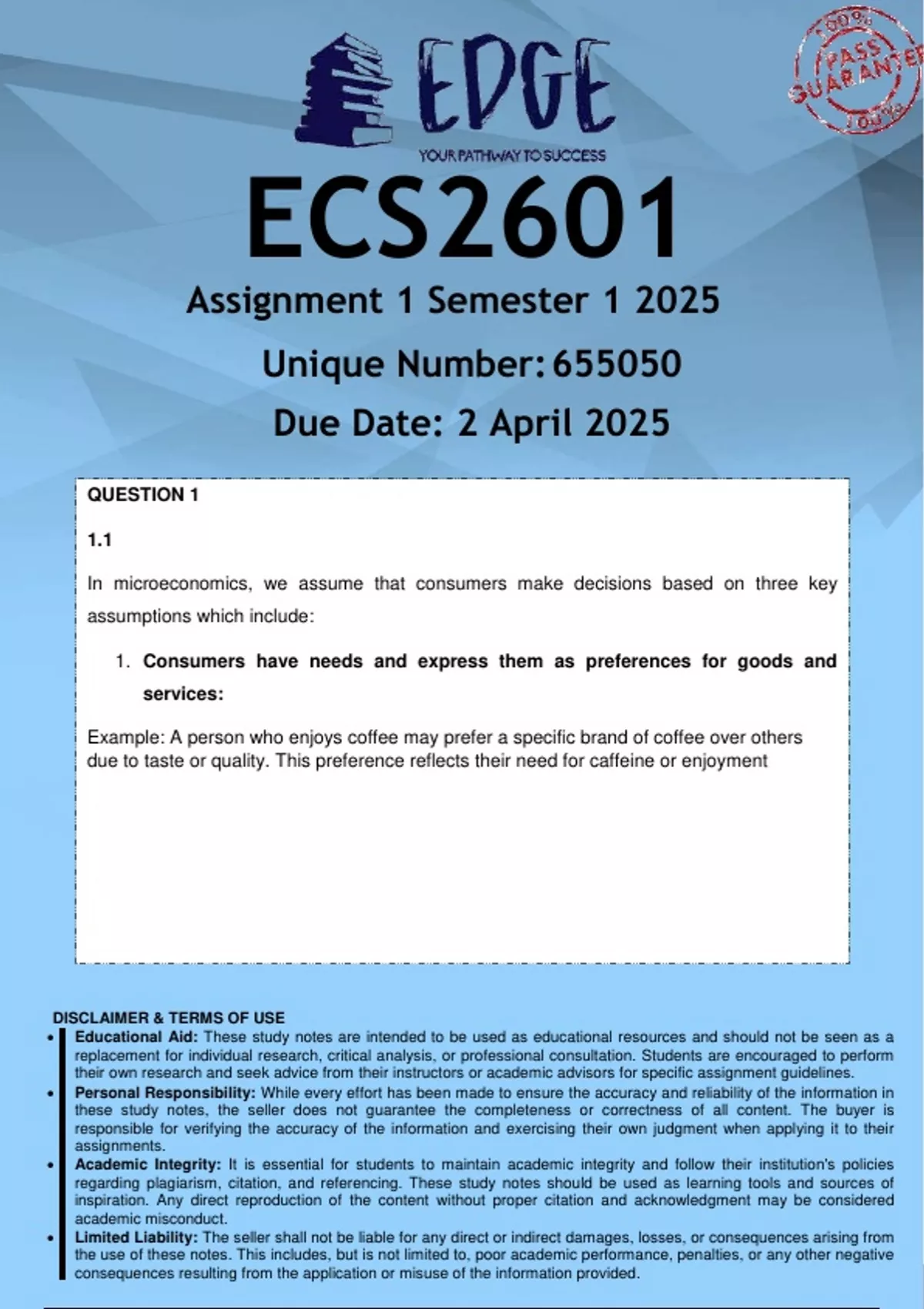 ECS2601 Assignment 1 (ANSWERS) Semester 1 2025 - DISTINCTION GUARANTEED