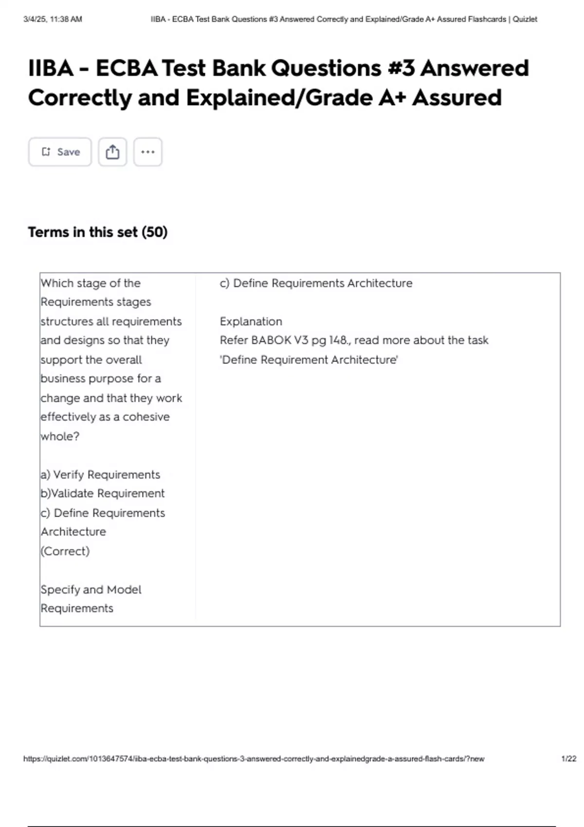 , 3/4/25, 11:38 AM IIBA - ECBA Test Bank Questions #3 Answered Correctly and Explained/Grade A+ Assured Flashcards | Quizlet